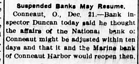 Suspended Banks May Resume. Conneaut, O., Dec. 21.-Bank inspector Duncan today said he thought the affairs of the National bank of Conneaut might be adjusted within ten days and that it and the Marine bank of Conneaut Harbor would reopen then,
