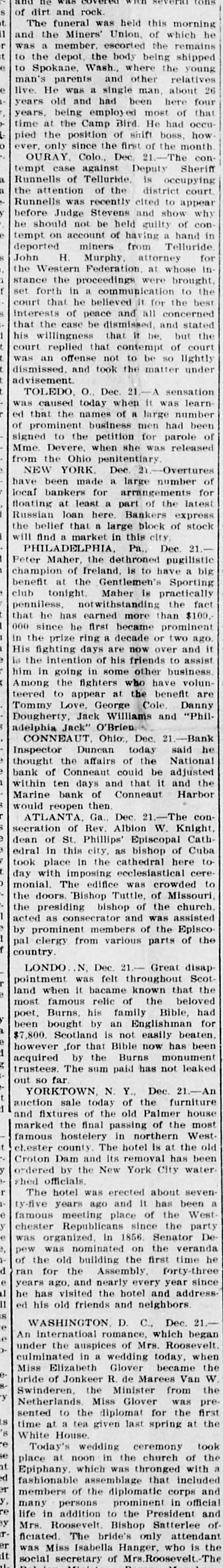 and he rock. t morning of The dirt funeral and was Union, held this of which remains he t and the member. Miners' escorted being the shipped was the a depot. the body where the relatives young to Wash., and other about man's a single here live. He had of years old was and employ ed been most He had years. being Camp Bird. boss, time at of of the to Spokane. parents man, month occu- how that four 26 pied the since the 21. The tempt only the position Dec. first shift Sheriff conever, OURAY. case of Colo., against Telluride. Deputy district is occupying court. the Runnells Runnells attention was Stevens recently of the and cited show to of appear why conbefore Judge be held guilty hand in he should account not of having a Telluride for tempt on miners from attorney indeported John H. Murphy Federation were at whose brought. the Western the proceedings communication the to best the stance set forth in a believed it for concerned court that of he peace and all and stated be but the interests that the case dismissed. that If be. of court his willingness that contempt be so lightly court was an replied offense and took not the to matter under O., Dec. it was dismissed. advisement. TOLEDO. when 21.- A sensation number learncaused today a large to the men of signed when of petition released was ed prominent that the names business of she for was parole had been of Mme. the Devere. Ohio penitentiary 21. Overtures been from YORK. Dec. large number for bankers part of have NEW made for a arrangements the floating here. of Russian a large local at loan least a Bankers block express stock will And a 21. Pa., the belief that market in this city. Dec. of PHILADELI ELPHIA. dethroned pugilistic big Maher, the is to have a benefit champion Peter at the Ireland. Gentlemen's Maher 18 practically the Sporting fact since club penniless. tonight. has earned st withstanding became more than prominent $100. it that he he first decade or two ago. and 000 in the prize ring days a are friends now over to assist His the fighting intention of some his other business. volunthe at the him in going fighters in who have benefit are Among appear Cole. Danny Love, Williams Jack" Dec. Tommy Dougherty, teered to Jack George O'Brien and 21.-Bank "PhilDuncan adelphia CONNEAUT Ohio., today said he National Inspector the affairs of the be adjusted thought of Conneaut could that it and the Marine bank within bank ten days of and Conneaut Harbor conwould reopen then Dec. 21. The Knight, ATLANTA Ga., Albion W. Cathof Cuba secration of St. Phillips' Rev. as Episcopal bishop of to dean this city, cathedral here cereto edral took with place in imposing in the ecclesiastical was crowded The of day edifice Missouri, Bishop of the monial. the doors. presiding bishop Tuttle, and was assisted church, the consecrator of the Episco country acted by pal prominent clergy as from members various parts of the disap known LONDO N. Dec. felt 21.- throughout Great Scot- the when it the land pointment famous was bacame relic of Bible, that beloved had a poet. most Burns, his an family Englishman beaten, for been bought by is not easily has been $7,800. ,for that Bible now acquired by sum the paid has not out so trustees. however far Scotland The Burns Dec. monument 21.-An leaked YORKTOWN, N. of Y. the furniture house sale today old Palmer Westauction marked and fixtures the final of the passing in northern of at the the most old famous hostelery hotel is chester county. The its removal has water been ordered by Croton Dam the and New York City hotel it shed officials. was erected about has been seven- a famous The years ago and of the West party chester e, ty-five meeting Republicans in place 1856. since the Senator the veranda Dewas organized on time he d of the old Assembly, pew was nominated building the first forty-three e I ran for the nearly every year address since years ago, and the hotel and 11 is 21 he ed his has old visited friends and neighbors. Dec. e e WASHINGTON D. C., which began ointernatioal romance, Mrs. Roosevelt. under the a wedding e culminated An auspices in of today. became when the R. de Marees 8. bride of Minister y Miss Elizabeth Swinderen. Jonkeer the Glover from was Van first pre- the W. Miss Glover for the s time Netherlands diplomat at the 's sented at to a tea the given last spring e took se White House. wedding ceremony of the at Today's at noon in the thronged church with a d er y, of the in fashionable Epiphany. place which assemblage diplomatic was that corps included official and re by many addition to the Satterlee r er Mrs. bride's only the members life in Roosevelt. persons Bishop prominent President attendant is and ofsocial ficiated. The Isabella Hanger, Roosevelt who The was Miss secretary of Mrs.