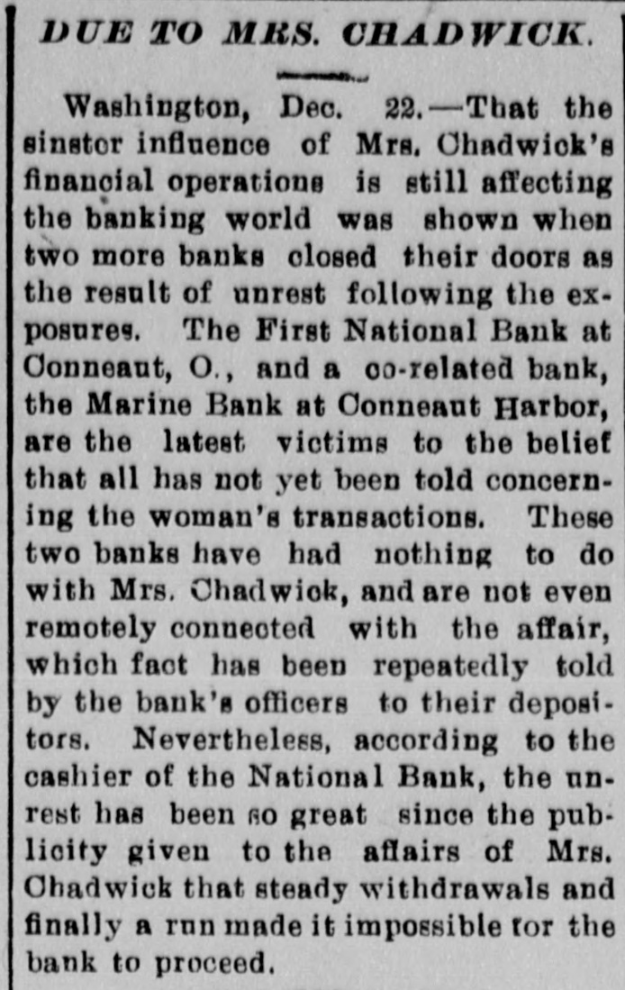DUE TO MRS. CHADWICK Washington, Dec. 22.-That the sinstor influence of Mrs. Chadwick's financial operations is still affecting the banking world was shown when two more banks closed their doors as the result of unrest following the exposures. The First National Bank at Conneaut, O., and a oo-related bank, the Marine Bank at Conneaut Harbor, are the latest victims to the belief that all has not yet been told concerning the woman's transactions. These two banks have had nothing to do with Mrs. Chadwick, and are not even remotely connected with the affair, which fact has been repeatedly told by the bank's officers to their depositors. Nevertheless, according to the cashier of the National Bank, the unrest has been GO great since the publicity given to the affairs of Mrs. Chadwick that steady withdrawals and finally a run made it impossible for the bank to proceed.
