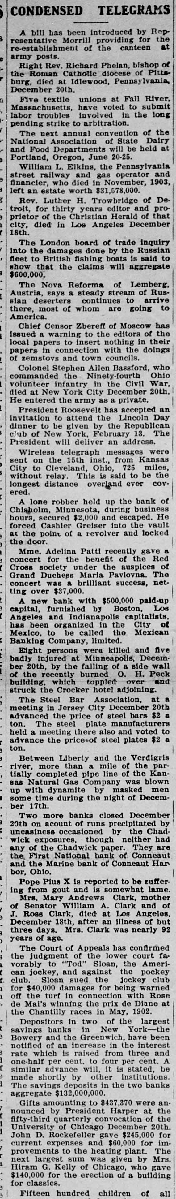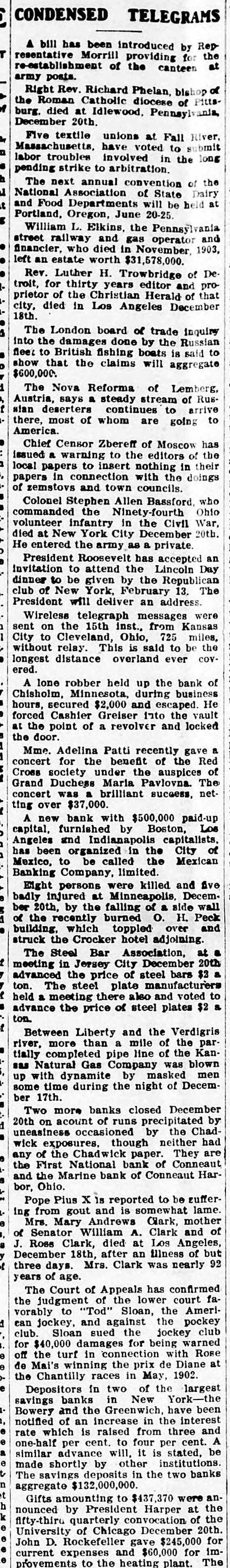 CONDENSED TELEGRAMS A bill has been introduced by Representative Morrill providing for the re-establishment of the canteen at army posts. Right Rev. Richard Phelan, bishop of the Roman Catholic diocese of Pittsburg. died at Idlewood, Pennsylvania, December 20th. Five textile unions at Fall River, 7 Massachusetts, have voted to submit labor troubles involved in the long pending strike to arbitration. The next annual convention of the National Association of State Dairy and Food Departments will be held at Portland, Oregon, June 20-25. William L. Elkins, the Pennsylvania street railway and gas operator and financier, who died in November, 1903, left an estate worth $31,578,000. Rev. Luther H. Trowbridge of De troit, for thirty years editor and proprietor of the Christian Herald of that city, died in Los Angeles December 18th. The London board of trade inquiry into the damages done by the Russian fleet to British fishing boats is said to show that the claims will aggregate $600,000. The Nova Reforma of Lemberg, Austria, says a steady stream of Russian deserters continues to arrive there, most of whom are going to America. Chief Censor Zbereff of Moscow has issued a warning to the editors of the local papers to insert nothing in their papers in connection with the doings of zemstovs and town councils. Colonel Stephen Allen Bassford, who commanded the Ninety-fourth Ohio volunteer infantry in the Civil War. died at New York City December 20th. He entered the army as a private. President Roosevelt has accepted an invitation to attend the Lincoln Day dinner to be given by the Republican club of New York, February 13. The President will deliver an address. Wireless telegraph messages were sent on the 15th inst., from Kansas City to Cleveland, Ohio, 725 miles, without relay. This is said to be the longest distance overland ever covered. A lone robber held up the bank of Chisholm, Minnesota, during business hours, secured $2,000 and escaped. He forced Cashier Greiser into the vault at the point of a revolver and locked the door. Mme. Adelina Patti recently gave a concert for the benefit of the Red Cross society under the auspices of Grand Duchess Maria Pavlovna. The concert was a brilliant success, netting over $37,000. A new bank with $500,000 paid-up capital, furnished by Boston, Los Angeles and Indianapolis capitalists, has been organized in the City of Mexico, to be called the Mexican Banking Company, limited. Eight persons were killed and five badly injured at Minneapolis, December 20th, by the falling of a side wall of the recently burned O. H. Peck building, which toppled over and struck the Crocker hotel adjoining. The Steel Bar Association, at b meeting in Jersey City December 20th advanced the price of steel bars $2 ton. The steel plate manufacturers held a meeting there also and voted to advance the price.of steel plates $2 a ton. e e Between Liberty and the Verdigris river, more than a mile of the partially completed pipe line of the Kansas Natural Gas Company was blown up with dynamite by masked men some time during the night of December 17th. Two more banks closed December a 20th on acount of runs precipitated by uneasiness occasioned by the Chadwick exposures, though neither had any of the Chadwick paper. They are the First National bank of Conneaut and the Marine bank of Conneaut Har bor, Ohio, 1 Pope Plus X is reported to be suffer. ing from gout and is somewhat lame. Mrs. Mary Andrews Clark, mother of Senator William A. Clark and / J. Ross Clark, Angeles, of e died at Los December 18th, after an illness of but 3 three days. Mrs. Clark was nearly 92 b years of age, The Court of Appeals has confirmed 3 the judgment of the lower court faa vorably to "Tod" Sloan, the Amerif can jockey, and against the pockey f club. Sloan sued the jockey club h for $40,000 damages for being warned 1 off the turf in connection with Rose de Mai's winning the prix de Diane at the Chantilly races in May, 1902. Depositors in two of the largest t savings banks in New York-the e Bowery and the Greenwich, have been notified of an increase in the interest rate which is raised from three and I one-half per cent. to four per cent. A ( advance will, it is e by other made The similar savings shortly institutions. stated, be 1 deposits in the two banks aggregate $132,000,000. Gifts amounting to $437,370 were an. e y nounced by President Harper at the 1 fifty-third quarterly convocation of the University of Chicago December 20th. 1 - John D. Rockefeller gave $245,000 for y current expenses and $60,000 for im- provements to the heating plant. The a next largest sum was given by Mrs. Hiram G. Kelly of Chicago, who gave : $140,000 for the erection of a building for classics. e e Fifteen hundred children of all