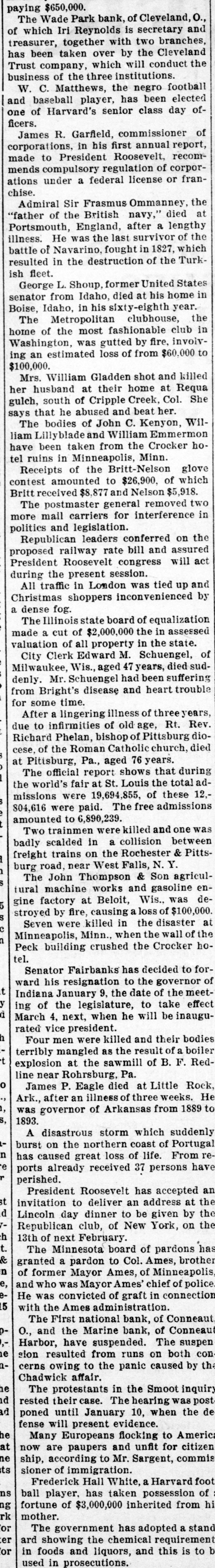 paying $650,000. The Wade Park bank, of Cleveland, O., of which Iri Reynolds is secretary and treasurer, together with two branches, has been taken over by the Cleveland Trust company, which will conduct the business of the three institutions. W. C. Matthews, the negro football and baseball player, has been elected one ficers. of Harvard's senior class day ofJames R. Garfield, commissioner of corporations, in his first annual report, made to President Roosevelt, recommends compulsory regulation of corporations chise. under a federal license or franAdmiral Sir Frasmus Ommanney, the "father of the British navy," died at Portsmouth, England, after a lengthy illness. He was the last survivor of the battle of Navarino, fought in 1827, which resulted in the destruction of the Turkish fleet. George L. Shoup, former United States senator from Idaho, died at his home in Boise, Idaho, in his sixty-eighth year. The Metropolitan clubhouse, the home of the most fashionable club in Washington, was gutted by fire, involv$100,000. ing an estimated loss of from $60,000 to Mrs. William Gladden shot and killed her husband at their home at Requa gulch, south of Cripple Creek, Col. She says that he abused and beat her. The bodies of John C. Kenyon, William Lillyblade and William Emmermon have been taken from the Crocker hotel ruins in Minneapolis, Minn. Receipts of the Britt-Nelson glove contest amounted to $26,900. of which Britt received $8,877 and Nelson $5,918. The postmaster general removed two more mail carriers for interference in politics and legislation. Republican leaders conferred on the proposed railway rate bill and assured President Roosevelt congress will act during the present session. All traffic in London was tied up and Christmas shoppers inconvenienced by a dense fog. The Illinois state board of equalization made a cut of $2,000,000 the in assessed valuation of all property in the state. City Clerk Edward M. Schuengel, of Milwaukee, Wis., aged 47 years, died suddenly. Mr. Schuengel had been suffering from Bright's disease and heart trouble for some time. After a lingering illness of three years, due to infirmities of old age, Rt. Rev. Richard Phelan, bishop of Pittsburg diocese, of the Roman Catholic church, died at Pitisburg, Pa., aged 76 years. The official report shows that during the world's fair at St. Louis the total admissions were 19,694,855, of these 12,804,616 were paid. The free admissions amounted to 6,890,239. Two trainmen were killed and one was badly scalded in a collision between freight trains on the Rochester & Pittsburg road, near West Falls, N. Y. The John Thompson & Son agricultural machine works and gasoline engine factory at Beloit, Wis., was destroyed by fire, causing a loss of $100,000. Seven were killed in the disaster at Minneapolis, Minn., when the wall of the tel. Peck building crushed the Crocker hoSenator Fairbanks has decided to forward his resignation to the governor of Indiana January 9, the date of the meeting of the legislature, to take effect March 4, next, when he will be inaugurated vice president. Four men were killed and their bodies terribly mangled as the result of a boiler explosion at the sawmill of B. F. Redline near Rohrsburg, Pa. James P. Eagle died at Little Rock, Ark., after an illness of three weeks. He 1893. was governor of Arkansas from 1889 to A disastrous storm which suddenly burst on the northern coast of Portugal has caused great loss of life. From reports perished. already received 37 persons have President Roosevelt has accepted an invitation to deliver an address at the Lincoln day dinner to be given by the Republican club, of New York, on the 13th of next February. The Minnesota board of pardons has granted a pardon to Col. Ames, brother of former Mayor Ames, of Minneapolis, and who was Mayor Ames' chief of police He was convicted of graft in connection with the Ames administration. The First national bank, of Conneaut O., and the Marine bank, of Conneaut Harbor, have suspended. The suspen sion resulted from runs on both con cerns owing to the panic caused by the Chadwick affair. e The protestants in the Smoot inquiry rested their case. The hearing was post d poned until January 10, when the de fense will present evidence. e Many Europeans flocking to America now are paupers and unfit for citizen