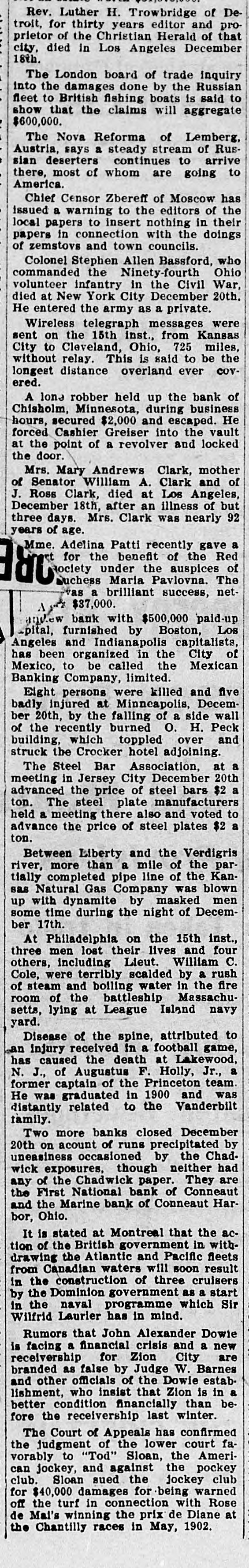 Rev. Luther H. Trowbridge and of pro- De for thirty years editor of that troit, of the Christian Herald December 18th. prietor city, died in Los Angeles London board of trade Russian inquiry The the damages done by the to into to British fishing boats is said fleet show that the claims will aggregate $600,000. Nova Reforma of Lemberg. RusThe says a steady stream of arrive Austria, deserters continues to to sian there, most of whom are going America. Censor Zbereff of Moscow has the Chief warning to the editors of their issued papers a to insert nothing in doings local in connection with the of papers zemstovs and town councils. Colonel Stephen Allen Bassford, Ohio who commanded the Ninety-fourth volunteer infantry in the Civil War, 20th. died at New York City December He entered the army as a private. Wireless telegraph messages Kansas were on the 15th inst., from miles, sent to Cleveland, Ohio, 725 be the City without relay. This is said to COVlongest distance overland ever ered. lone robber held up the business bank of Chisholm, A Minnesota, during He secured $2,000 and escaped. the vault hours, Cashier Greiser into locked at forced the point of a revolver and the door. Mary Andrews Clark, mother and of Mrs. Senator William A. Clark of J. Ross Clark, died at Los Angeles, of but December 18th, after an illness 92 three days. Mrs. Clark was nearly years of age. Mme. Adelina Patti recently gave Red a Linest for the benefit of the dociety under the auspices The of Suchess Maria Pavlovna. netwas a brilliant success, $37,000. bank with $500,000 paid-up Los and.ew furnished by Boston, capitalists -pital, and Indianapolis of Angeles been organized in the City Mexican has to be called the Company, Banking Mexico, limited. killed and Eight persons were Decem- five injured at Minneapolis, wall badly 20th, by the falling of a side Peck of ber the recently burned O. H. and which toppled over struck building, the Crocker hotel adjoining. Steel Bar Association, at 20th a The in Jersey City December $2 a meeting advanced the price of steel bars The steel plate manufacturers voted to held ton. meeting there also and $2 a advance a the price of steel plates ton. Between Liberty and the Verdigris parmore than a mile of the Kantially river, completed pipe line of the blown Natural Gas Company was men sas with dynamite by masked Decemup some time during the night of ber 17th. Philadelphia on the 15th inst., four At lost their lives and C. three men including Lieut. William rush others, were terribly scalded by the a fire Cole, and boiling water in of steam of the battleship Massachu- navy setts, room lying at League Island yard. Disease of the spine, attributed game, to injury received in a football Lakewood, an caused the death at Jr., a has N. of Augustus F. Holly, team. former J., captain of the Princeton and was was graduated in 1900 Vanderbilt distantly He related to the family. more banks closed December by Two of runs precipitated 20th occasioned by though uneasiness on exposures. acount neither the Chad- had are wick of the Chadwick paper. Conneaut They any First National bank of Har and the the Marine bank of Conneaut bor, Ohio. stated at Montreal that the with- acIt of is the British government in fleets tion the Atlantic and Pacific result drawing Canadian waters will soon cruisers from the construction of three start in the Dominion government as a Sir by the naval programme which in Wilfrid Laurier has in mind. that John Alexander Dowie a financial crisis a new is for Zion Rumors facing and City are branded receivership as false by Judge W. Barnes estab other officials of the Dowie in and who insist that Zion is be- a better lishment, condition financially than fore the receivership last winter. Court of Appeals has confirmed faThe judgment of the lower court the to "Tod" Sloan, the Ameriand against club can sued the club. vorably jockey, Sloan jockey the warned pockey damages for being Rose for in connection at off winning the prix de de Mai's the $40,000 turf with 1902. Diane the Chantilly races in May,