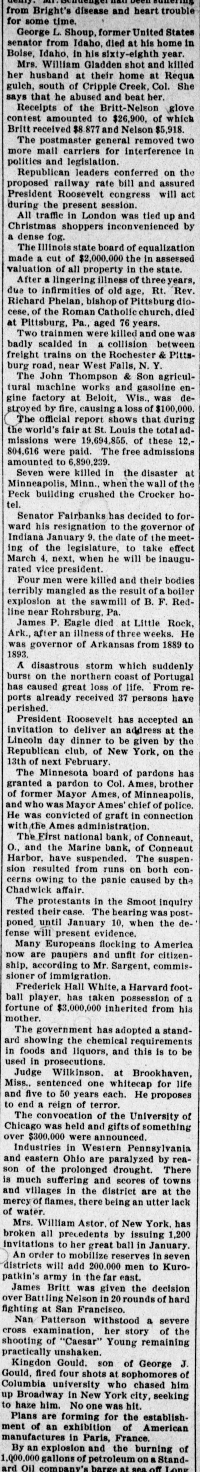 паад DELL aSranug ' TAT from Bright's disease and heart trouble for some time. George L. Shoup, former United States senator from Idaho, died at his home in Boise, Idaho, in his sixty-eighth year. Mrs. William Gladden shot and killed her husband at their home at Requa gulch, south of Cripple Creek, Col. She ays that he abused and beat her. Receipts of the Britt-Nelson glove contest amounted to $26,900. of which Britt received $8.877 and Nelson $5,918. The postmaster general removed more mail carriers for interference politics and legislation. Republican leaders conferred on the proposed railway rate bill and assured President Roosevelt congress will during the present session. All traffic in London was tied up and Christmas shoppers inconvenienced by a dense fog. The Illinois state board of equalization made a cut of $2,000,000 the in assessed valuation of all property in the state. After a lingering illness of three years due to infirmities of old age, Rt. Rev. Richard Phelan, bishop of Pittsburg diocese, of the Roman Catholic church, died at Pittsburg, Pa., aged 76 years. Two trainmen were killed and one was badly scalded in a collision between freight trains on the Rochester & Pitts burg road, near West Falls, N. Y. The John Thompson & Son agricultural machine works and gasoline engine factory at Beloit, Wis., was stroyed by fire, causing a loss of $100,000 The official report shows that during the world's fair at St. Louis the total admissions were 19,694,855. of these 12,804,616 were paid. The free admissions amounted to 6,890,239. Seven were killed in the disaster Minneapolis, Minn., when the wall of the Peck building crushed the Crocker hotel. Senator Fairbanks has decided to forward his resignation to the governor of Indiana January 9. the date of the meeting of the legislature, to take effect March 4, next, when he will be inaugurated vice president. Four men were killed and their bodies terribly mangled as the result of a boiler explosion at the sawmill of B. F. Redline near Rohrsburg, Pa. James P. Eagle died at Little Rock, Ark., after an illness of three weeks. He was governor of Arkansas from 1889 to 1893 A disastrous storm which suddenly burst on the northern coast of Portugal has caused great loss of life. From ports already received 37 persons have perished. President Roosevelt has accepted invitation to deliver an address at the Lincoln day dinner to be given by the Republican club, of New York, on the 13th of next February. The Minnesota board of pardons has granted a pardon to Col. Ames, brother of former Mayor Ames, of Minneapolis, nd who was Mayor Ames' chief of police. He was convicted of graft in connection with the Ames administration. The First national bank, of Conneaut, O., and the Marine bank, of Conneaut Harbor, have suspended. The suspension resulted from runs on both concerns owing to the panic caused by the Chadwick affair. The protestants in the Smoot inquiry rested their case. The hearing was postponed until January 10, when the deense will present evidence. Many Europeans flocking to America how are paupers and unfit for citizenship, according to Mr. Sargent, commissioner of immigration. Frederick Hall White, a Harvard footall player. has taken possession of a ortune of $3,000,000 inherited from his nother. The government has adopted a standrd showing the chemical requirements n foods and liquors, and this is to be ised in prosecutions. Judge Wilkinson. at Brookhaven, Miss., sentenced one whitecap for life nd five to 50 years each. He proposes