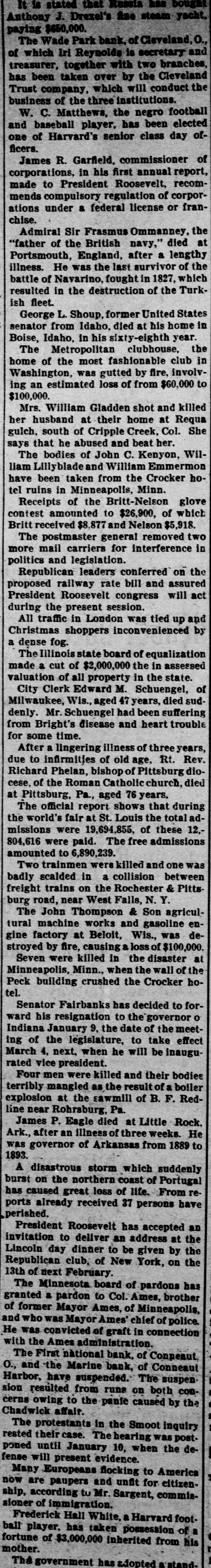 seq wisen? Jun state $1 = Anthony J. Drexel's fine steam yacht, paying $650,000. The Wade Park bank, of Cleveland, O., pus of Refunides HI which jo treasurer, together with two branches, has been taken over by the Cleveland Trust company, which will conduct the business of the three institutions. W. C. Matthews, the negro football and baseball player, has been elected one of Harvard's senior class day officers. James R. Garfield, commissioner of corporations, in his first annual report, made to President Roosevelt, recommends compulsory regulation of corporations under a federal license or franchise. Admiral Sir Frasmus Ommanney, the "father of the British navy," died at Portsmouth, England, after a lengthy illness. He was the last survivor of the battle of Navarino, fought in 1827, which resulted in the destruction of the Turkfreeth us! George L. Shoup, former United States senator from Idaho, died at his home in Boise, Idaho, in his sixty-eighth year. The Metropolitan clubhouse, the home of the most fashionable club in Washington, was gutted by fire, involving an estimated loss of from $60,000 to $100,000. Mrs. William Gladden shot and killed her husband at their home at Requa gulch, south of Cripple Creek, Col. She says that he abused and beat her. The bodies of John C. Kenyon, William Lillyblade and William Emmermon have been taken from the Crocker hotel ruins in Minneapolis, Minn. Receipts of the Britt-Nelson glove contest amounted to $26,900, of which Britt received $8,877 and Nelson $5,918. The postmaster general removed two more mail carriers for interference in politics and legislation. Republican leaders conferred on the proposed railway rate bill and assured President Roosevelt congress will act during the present session. pus dn the SEM иорпот up traff IIV Christmas shoppers inconvenienced by a dense fog. The Illinois state board of equalization made a cut of $2,000,000 the in assessed valuation of all property in the state. City Clerk Edward M. Schuengel, of Milwaukee, Wis., aged 47 years, died suddenly. Mr. Schuengel had been suffering from Bright's disease and heart trouble for some time. After a lingering illness of three years, due to infirmities of old age, Rt. Rev. Richard Phelan, bishop of Pittsburg diocese, of the Roman Catholic church, died at Pittsburg, Pa., aged 76 years. The official report shows that during the world's fair at St. Louis the total admissions were 19,694,855, of these 12,804,616 were paid. The free admissions amounted to 6,890,239. Two trainmen were killed and one was badly scalded in a collision between freight trains on the Rochester & Pittsburg road, near West Falls, N. Y. The John Thompson & Son agricultural machine works and gasoline engine factory at Beloit, Wis., was destroyed by fire, causing a loss of $100,000. Seven were killed in the disaster at Minneapolis, Minn., when the wall of the Peck building crushed the Crocker hotel. Senator Fairbanks has decided to forward his resignation to the governor o Indiana January 9, the date of the meeting of the legislature, to take effect March 4, next, when he will be inaugurated vice president. Four men were killed and their bodies terribly mangled as the result of boiler explosion at the sawmill of B. F. Redline near Rohrsburg, Pa. James P. Eagle died at Little Rock. Ark., after an illness of three weeks. He was governor of Arkansas from 1889 to 1893. A disastrous storm which suddenly burst on the northern coast of Portugal has caused great less of life. From reports already received 37 persons have perished. President Roosevelt has accepted an invitation to deliver an address at the Lincoln day dinner to be given by the Republican club, of New York, on the February ixan jo 1334 The Minnesota board of pardons has granted a pardon to Col. Ames, brother of former Mayor Ames, of Minneapolis, and who was Mayor Ames' chief of police. concertion up graft JO contricted SUM H with the Ames administration. The First national bank, of Conneaut. O., and the Marine bank, of Conneaut Harbor, have suspended. The suspen sion resulted from runs on both concerns owing to the panie caused by the Chadwick affair. The protestants in the Smoot inquiry rested their case. The hearing was post. poned until January 10, when the defense will present evidence. Many Europeans flocking to America now are paupers and unfit for citizenship, according to Mr. Sargent, commissioner of immigration. Frederick Hall White, a Harvard football player. has taken possession of a fortune of $3,000,000 inherited from his mother. The government has adopted a stand.