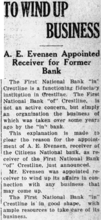 The First National Bank "in" Crestline functioning fiduciary institution in Crestline. The First National Bank "of" Crestline, not an active concern. simply an organization the business of which was taken over some years by the bank. This explanation made clear the reason for the appointof Evensen, receiver of the Citizens National bank. as ceiver of the First National Bank Crestline, just announced. Mr. Evensen was appointed ceiver wind up its affairs in connection with any business that may come The First National Bank Crestline good shape, with ample resources business.
