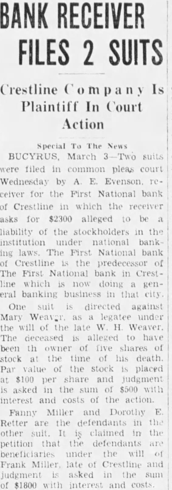 Special To The News BUCYRUS, March suits were filed in common pleas court Wednesday by E. Evenson ceiver for the First National bank of Crestline in which the receiver asks for $2300 alleged to be liability of the stockholders in the institution under national bank ing laws. The First National bank Crestline the predecessor of The First National bank in Crestline which doing general banking business in that city One directed against Mary Weaver legatee under the will of the late W Weaver. The deceased alleged to have been th owner of five shares of the time of his death Par value of the stock placed at $100 per share and judgment asked in the of $500 with interest and of the action. Fanny Miller and Dorothy Retter are the defendants in the other suit claimed in the petition that the defendants under will Frank Miller late of Crestline and asked in the of $1800 with interest and costs