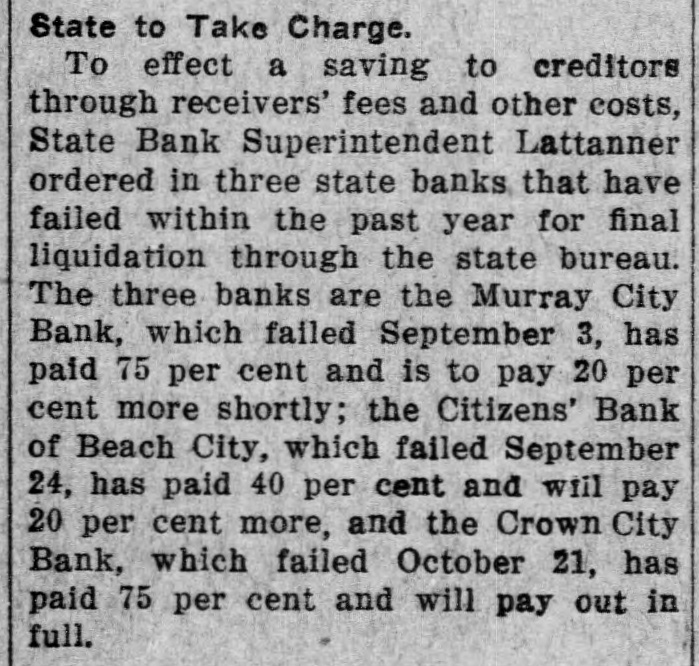 State to Take Charge. To effect a saving to creditors through receivers' fees and other costs, State Bank Superintendent Lattanner ordered in three state banks that have failed within the past year for final liquidation through the state bureau. The three banks are the Murray City Bank, which failed September 3, has paid 75 per cent and is to pay 20 per cent more shortly; the Citizens' Bank of Beach City, which failed September 24, has paid 40 per cent and will pay 20 per cent more, and the Crown City Bank, which failed October 21, has paid 75 per cent and will pay out in full.