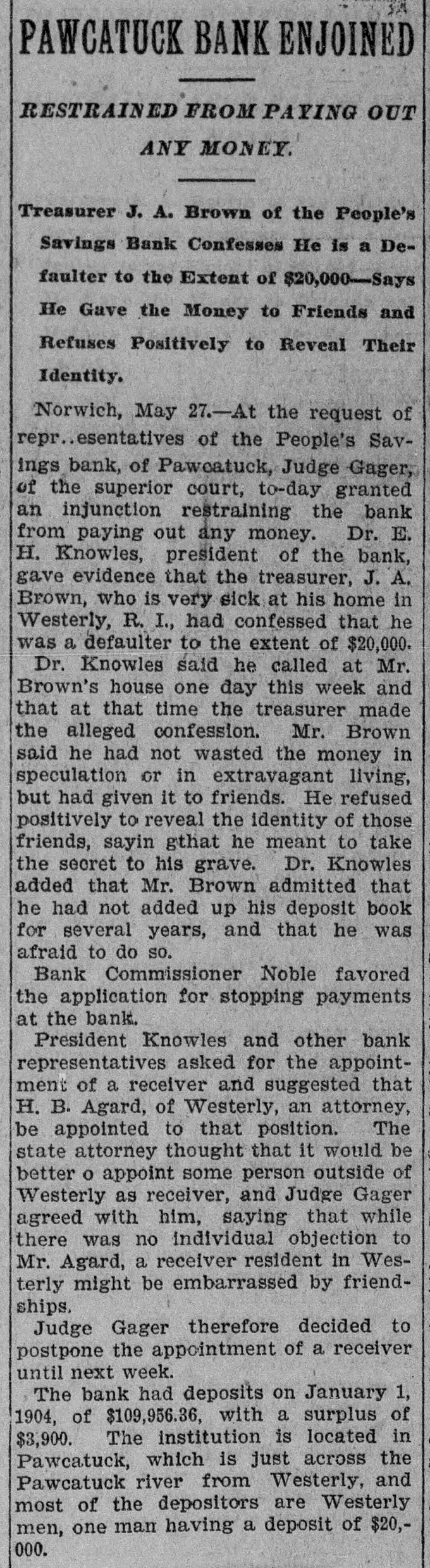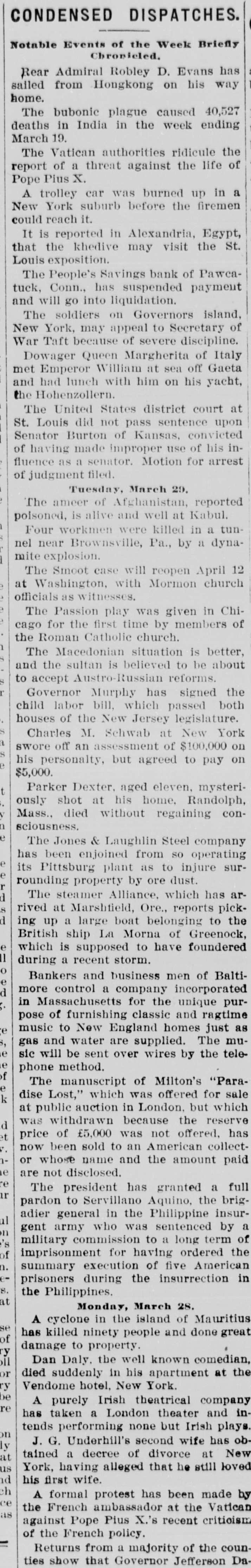 CONDENSED DISPATCHES. Notable Events of the Week Briefly Chronicled. Rear Admiral Robley D. Evans has sailed from Hongkong on his way home. The bubonic plague caused 40,527 deaths in India in the week ending March 19. The Vatican authorities ridicule the report of a threat against the life of Pope Pius X. A trolley car was burned up in a New York suburb before the firemen could reach it. It is reported in Alexandria, Egypt, that the khedive may visit the St. Louis exposition. The People's Savings bank of Pawcatuck, Conn., has suspended payment and will go into liquidation. The soldiers on Governors island, New York, may appeal to Secretary of War Taft because of severe discipline. Dowager Queen Margherita of Italy met Emperor William at sea off Gaeta and had lunch with him on his yacht, the Hohenzollern. The United States district court at St. Louis did not pass sentence upon Senator Burton of Kansas, convicted of having made improper use of his influence as a senator. Motion for arrest of judgment filed. Tuesday, March 29. The ameer of Afghanistan, reported poisoned, is alive and well at Kabul. Four workmen were killed in a tunnel near Brownsville, Pa., by a dynamite explosion. The Smoot case will reopen April 12 at Washington, with Mormon church officials as witnesses. The Passion play was given in Chicago for the first time by members of the Roman Catholic church. The Macedonian situation is better, and the sultan is believed to be about to accept Austro-Russian reforms. Governor Murphy has signed the child labor bill, which passed both houses of the New Jersey legislature. Charles M. Schwab at New York swore off an assessment of $100,000 on his personalty, but agreed to pay on $5,000. Parker Dexter, aged eleven, mysteriously shot at his home. Randolph, Mass., died without regaining consciousness. The Jones & Laughlin Steel company has been enjoined from SO operating its Pittsburg plant as to injure surrounding property by ore dust. The steamer Alliance, which has arrived at Marshfield, Ore., reports picking up a large boat belonging to the British ship La Morna of Greenock which is supposed to have foundered during a recent storm. Bankers and business men of Baltimore control a company incorporated in Massachusetts for the unique pur pose of furnishing classic and ragtime music to New England homes just as gas and water are supplied. The mu sic will be sent over wires by the tele phone method. The manuscript of Milton's "Para dise Lost," which was offered for sale at public auction in London, but which was withdrawn because the reserve d price of £5,000 was not offered, has now been sold to an American collect or whose name and the amount paid are not disclosed. The president has granted a ful ir pardon to Servillano Aquino, the brig adier general in the Philippine insur il gent army who was sentenced by : n military commission to a long term o of imprisonment for having ordered the summary execution of five America prisoners during the insurrection in the Philippines. at Monday, March 28. A cyclone in the island of Mauritiu has killed ninetri and dene