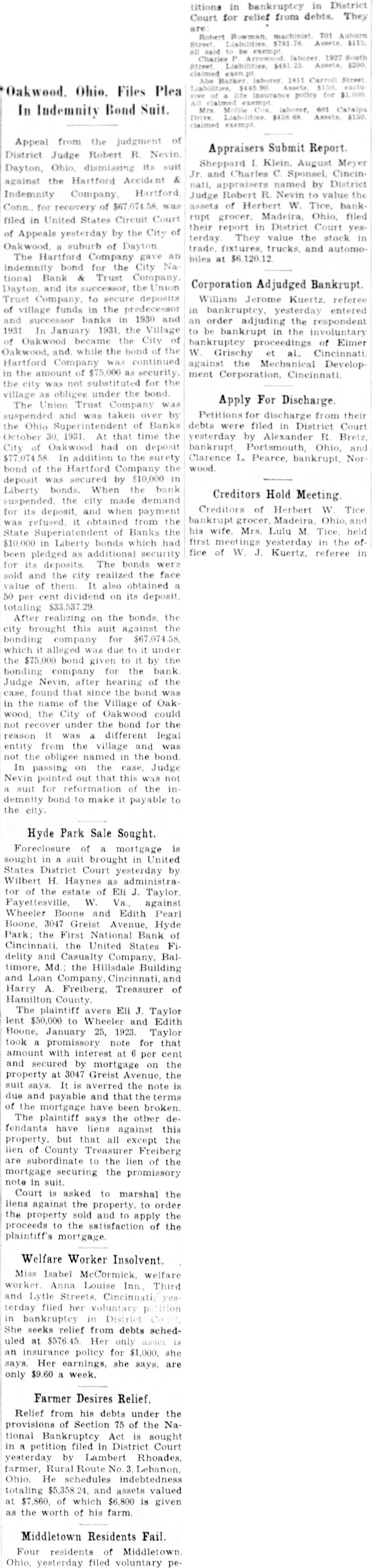 Oakwood. Ohio. Files Plea In Indemnity Bond Suit. Appeal from the judgment of District Judge Robert R. Nevin suit against the Hartford Accident Indemnity Hartford Conn. recovery of filed in United States Circuit Court of Appeals yesterday by the City of suburb Dayton The an indemnity bond for the City National Bank Trust Company Dayton and its the Union Trust to secure deposits of village funds in the and banks in 1930 and 1931 In January 1931 the Village of Oakwood became the City Oakwood, and while the of the Hartford was in the security. the city not for the village obligee the bond The Trust Company suspended and was taken by the Ohio of Banks 1931 At that time the City Oakwood had on deposit $77,074.58 In addition to the surety bond of the Hartford Company the deposit secured by $10,000 in Liberty When bank the city made demand for its and when payment was refused from the State Banks the $10,000 Liberty bonds which had been pledged as additional security for its deposits. The bonds were sold and the city realized the face value of also obtained 50 per cent dividend on its totaling $33,537.29 After realizing on the bonds the city brought this suit against the bonding company for which due under the $75,000 bond giver by the bonding for the bank Judge of the case, found that since the bond was in the name of the Village of Oak wood the City of Oakwood could not recover under the bond for the reason was different legal entity from the village and was not the obligee named the bond In passing on the case, Judge Nevin pointed out that this was not the demnity bond to make it payable the city. titions in bankruptcy in District Court for relief from debts They are Appraisers Submit Report. Sheppard Klein August Meyer Jr. and Sponsel, Cincinappraisers named by District Judge Robert R. Nevin to value the assets of Herbert W. Tice, bank rupt grocer Ohio, filed their report in District Court yesterday They value stock in trade fixtures trucks and automobiles at $6,120.12 Corporation Adjudged Bankrupt. William Jerome Kuertz referee order adjuding the respondent to be bankrupt in the involuntary bankruptey proceedings of Elmer Grischy Cincinnati against the Mechanical Apply For Discharge Petitions for discharge from their debts were filed in District Court yesterday by Alexander R Bretz bankrupt and Clarence L. Pearce, bankrupt, Nor wood Creditors Hold Meeting Creditors of Herbert W Tice bankrupt grocer Madeira Ohio and first meetings yesterday in the of fice of W J. Kuertz, referee in Hyde Park Sale Sought. Foreclosure of mortgage is sought in suit brought in United States District Court yesterday by Wilbert H. Haynes administrator of the estate of Eli J. Taylor Fayettesville, W against Wheeler and Edith Pearl Boone, 3047 Avenue, Hyde Park the First National Bank of Cincinnati the United States F1 delity and Casualty Company, Baltimore, Md. the Hillsdale Building and Loan Company Cincinnati and Harry A. Freiberg, Treasurer of Hamilton The plaintiff avers Eli J. Taylor lent $50,000 to Wheeler and Edith Boone, January 25, 1923. Taylor took promissory note for that amount with interest per cent and by mortgage on the at 3047 Greist Avenue, the suit says is the note is due and payable and that terms of the mortgage have been broken The plaintiff says the other defendants have liens against this property, but that all except the lien of County Treasurer Freiberg are subordinate the lien of the mortgage securing the promissory note in suit Court is asked to marshal the liens against the property, order the property sold and apply the the of the plaintiff's mortgage. Welfare Worker Insolvent. Miss Isabel McCormick welfare worker Anna Louise Third terday filed her voluntary P in bankruptcy She seeks relief from debts scheduled at $576.45 Her an policy for $1,000, she says Her earnings, she says, are only $9.60 week. Farmer Desires Relief. Relief from his debts under the provisions of Section 75 of the National Bankruptcy Act is sought in petition in District Court yesterday by Lambert Rhoades, farmer, Rural Route Lebanon, Ohio. He schedules indebtedness totaling and assets valued at $7,860 of which $6,800 is given as the worth of his farm. Middletown Residents Fail. Four residents of Middletown Ohio, yesterday filed voluntary pe-