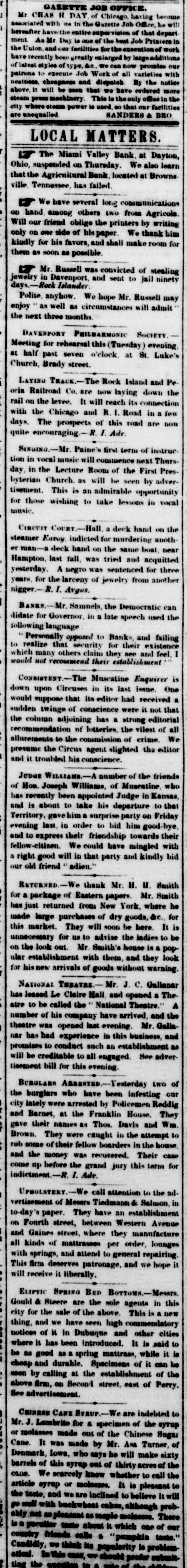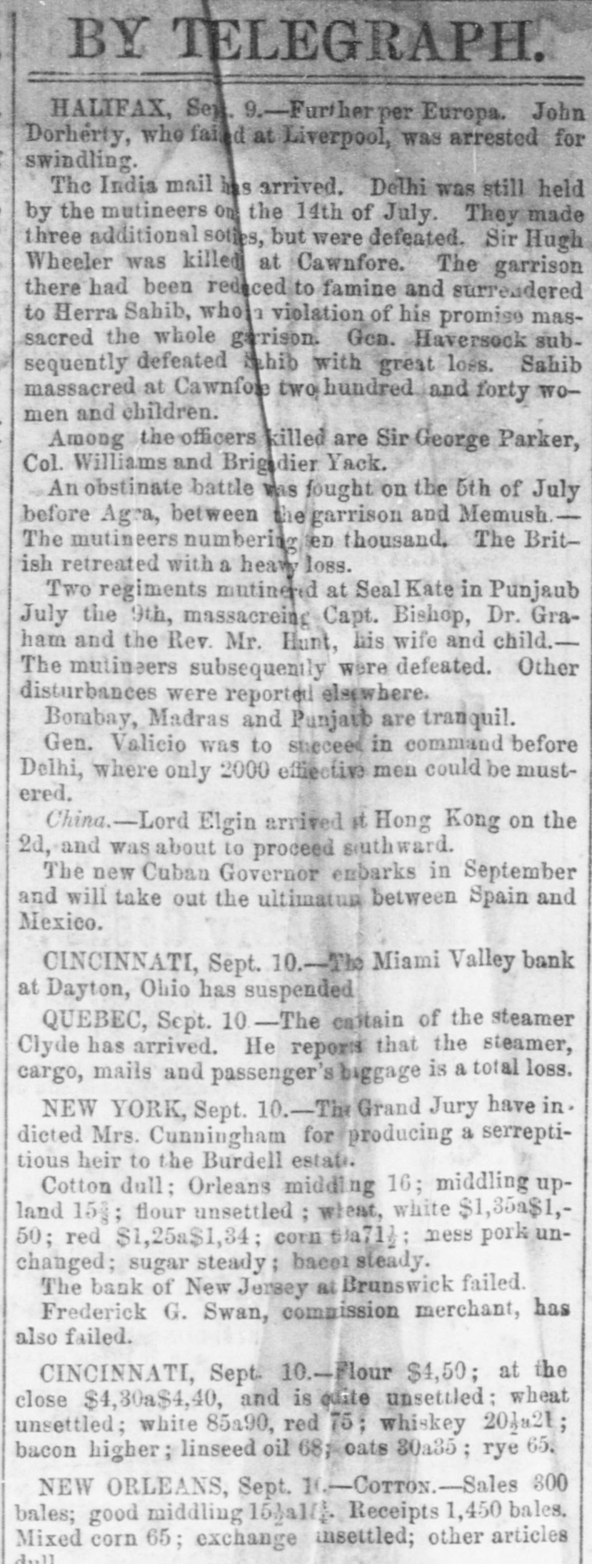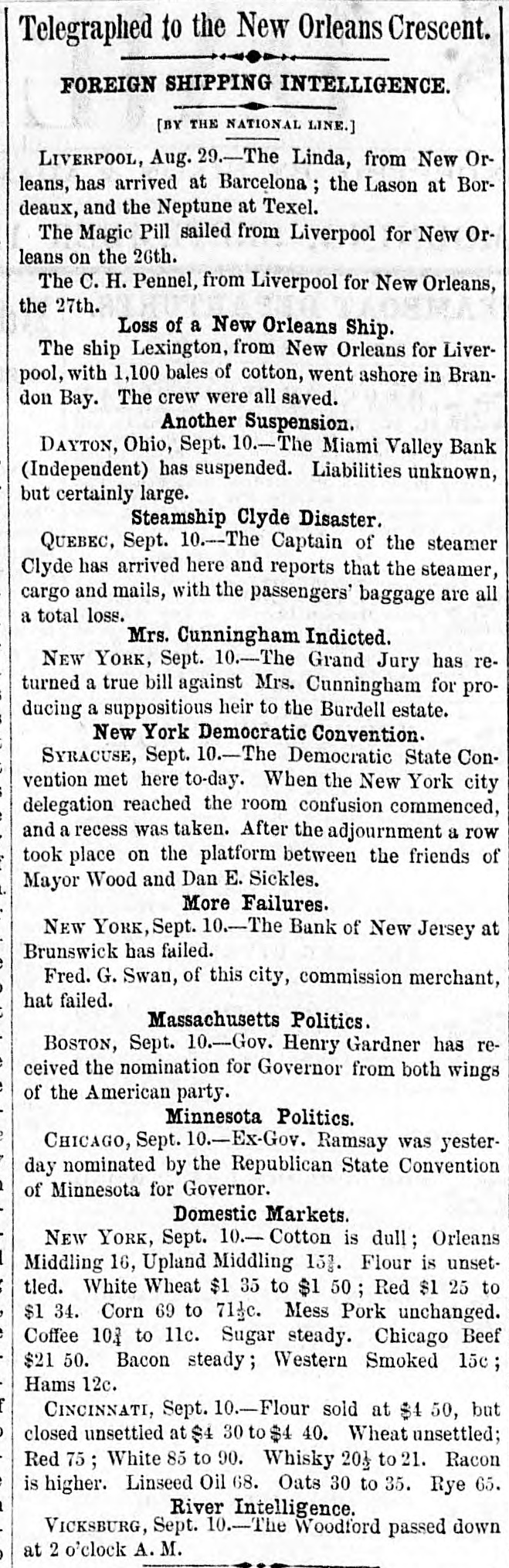 Telegraphed to the New Orleans Crescent. FOREIGN SHIPPING INTELLIGENCE. [BY THE NATIONAL LINE.] LIVERPOOL, Aug. 29.-The Linda, from New Orleans, has arrived at Barcelona ; the Lason at Bordeaux, and the Neptune at Texel. The Magic Pill sailed from Liverpool for New Orleans on the 26th. The C. H. Pennel, from Liverpool for New Orleans, the 27th. Loss of a New Orleans Ship. The ship Lexington, from New Orleans for Liverpool, with 1,100 bales of cotton, went ashore in Brandon Bay. The crew were all saved. Another Suspension. DAYTON, Ohio, Sept. 10.-The Miami Valley Bank (Independent) has suspended. Liabilities unknown, but certainly large. Steamship Clyde Disaster. QUEBEC, Sept. 10.--The Captain of the steamer Clyde has arrived here and reports that the steamer, cargo and mails, with the passengers' baggage are all a total loss. Mrs. Cunningham Indicted. NEW YORK, Sept. 10.-The Grand Jury has returned a true bill against Mrs. Cunningham for producing a suppositious heir to the Burdell estate. New York Democratic Convention. SYRACUSE, Sept. 10.-The Democratic State Convention met here to-day. When the New York city delegation reached the room confusion commenced, and a recess was taken. After the adjournment a row took place on the platform between the friends of Mayor Wood and Dan E. Sickles. More Failures. NEW YORK, Sept. 10.-The Bank of New Jersey at Brunswick has failed. Fred. G. Swan, of this city, commission merchant, hat failed. Massachusetts Politics. BOSTON, Sept. 10.-Gov. Henry Gardner has received the nomination for Governor from both wings of the American party. Minnesota Politics. CHICAGO, Sept. 10.-Ex-Gov. Ramsay was yesterday nominated by the Republican State Convention of Minnesota for Governor. Domestic Markets. NEW YORK, Sept. 10.-Cotton is dull; Orleans Middling 16, Upland Middling 153. Flour is unsettled. White Wheat $1 35 to $1 50 Red $1 25 to $1 34. Corn 69 to 713c. Mess Pork unchanged. Coffee 103 to 11c. Sugar steady. Chicago Beef $21 50. Bacon steady; Western Smoked 15c ; Hams 12c. CINCINNATI, Sept. -Flour sold at $4 50, but closed unsettled at $4 30 to $4 40. Wheat unsettled; Red 75; White 85 to 90. Whisky 201 to 21. Racon is higher. Linseed Oil 68. Oats 30 to 35. Rye 65. River Intelligence. VICKSBURG, Sept. 10.-The Woodford passed down at 2 o'clock A. M.