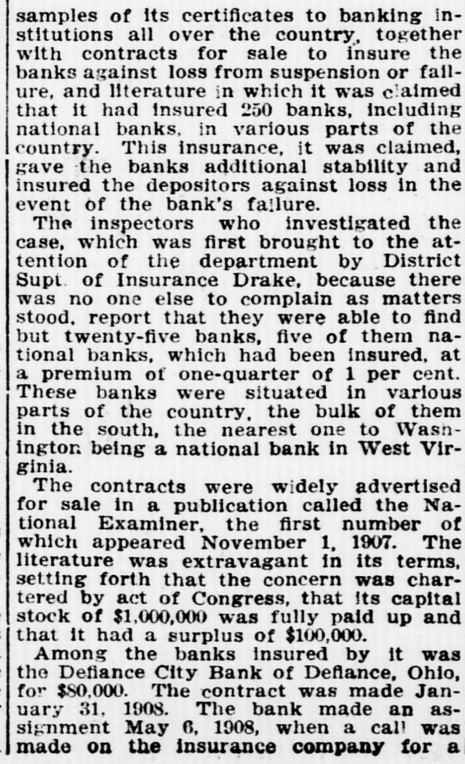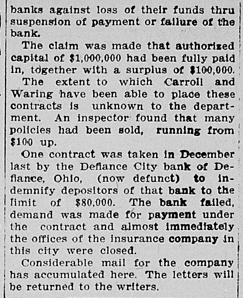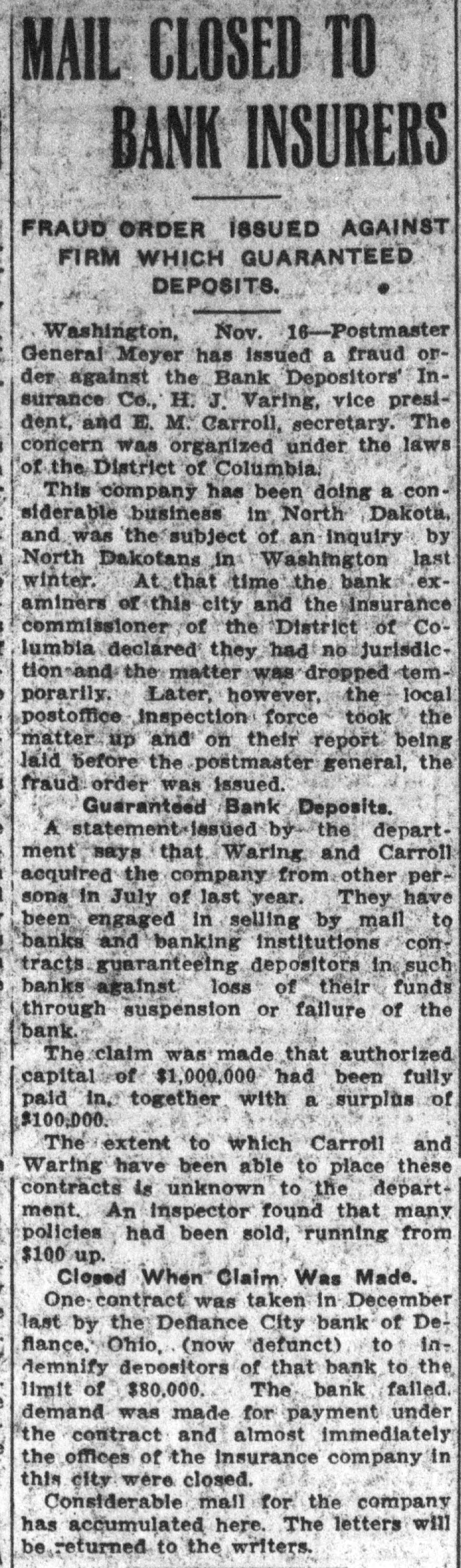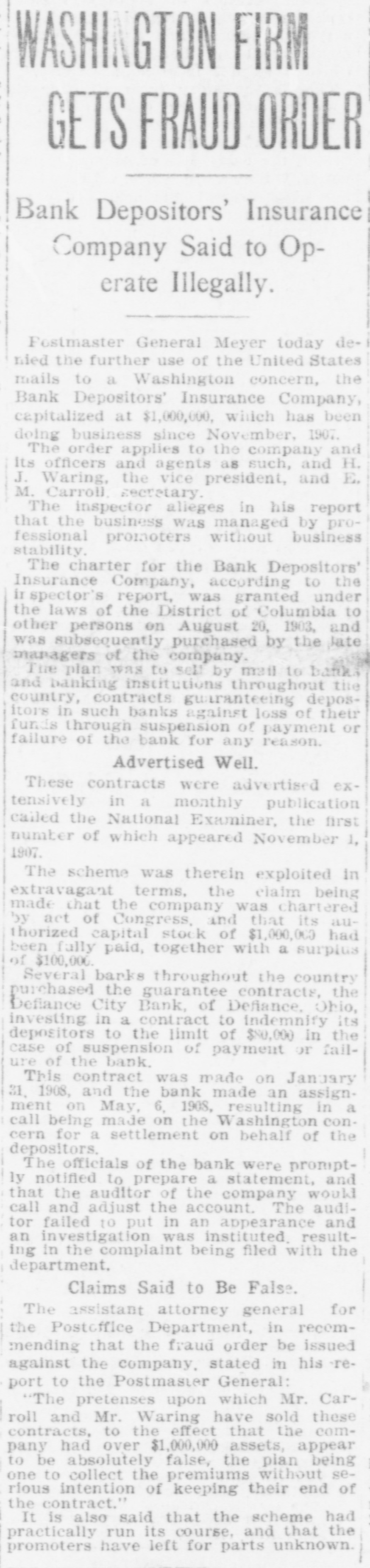 WASHIN GTON FIRM GETS FRAUD ORDER Bank Depositors' Insurance Company Said to Operate Illegally. Fostmaster General Meyer today denied the further use of the United States mails to a Washington concern, the Bank Depositors' Insurance Company, capitalized at $1,000,000, which has been doing business since November, 1907. The order applies to the company and its officers and agents as such, and H. J. Waring, the vice president, and E. M. Carroll secretary. The inspector alleges in his report that the business was managed by professional promoters without business stability. The charter for the Bank Depositors' Insurance Company, according to the in was the District of the spector's laws of report, granted Columbia under to other persons on August 20, 1903, and was subsequently purchased by the late managers of the company. The plan was to self by mail to banks and banking institutions throughout the country, contracts guaranteeing depositors in such banks against loss of their funds through suspension of payment or failure of the bank for any reason. Advertised Well. These contracts were advertised extensively in a monthly publication called the National Examiner, the first number of which appeared November 1, 1907. The scheme was therein exploited in extravagant terms. the claim being made that the company was chartered by act of Congress, and that its authorized capital stock of $1,000,000 had been fully paid, together with a surplus of $100,000. Several banks throughout the country purchased the guarantee contracts, the Defiance City Bank of Defiance Ohio, investing in a contract to indemnify its depositors to the limit of $80,000 in the case of suspension of payment or failure of the bank. This contract was made on January 31. 1908, and the bank made an assignment on May, 6. 1908, resulting in a call being made on the Washington concern for a settlement on behalf of the depositors. The officials of the bank were proniptly notified to prepare a statement, and that the auditor of the company would call and adjust the account. The auditor failed to put in an appearance and an investigation was instituted. resulting in the complaint being filed with the department. Claims Said to Be False. The assistant attorney general for the Postoffice Department, in recommending that the fraud order be issued against the company. stated in his report to the Postmaster General: "The pretenses upon which Mr. Carroll and Mr. Waring have sold these contracts, to the effect that the comhad over $1,000,000 false, the pany to be absolutely assets, plan appear being one to collect the premiums without serious intention of keeping their end of the contract." 3 that the scheme had