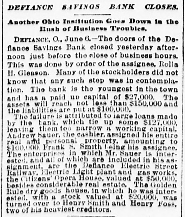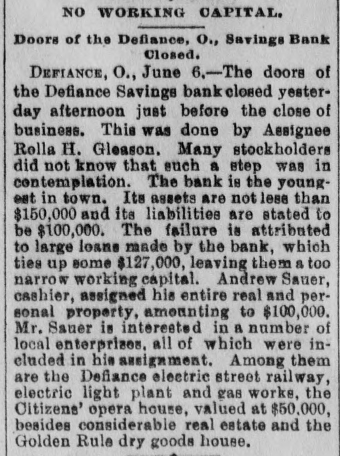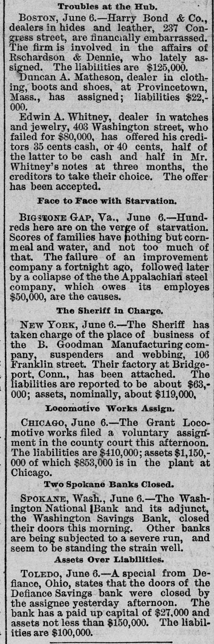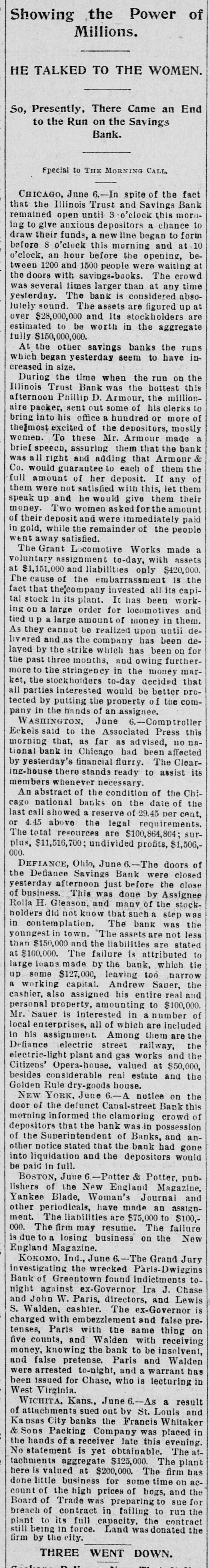 Showing the Power of Millions. HE TALKED TO THE WOMEN. So, Presently, There Came an End to the Run on the Savings Bank. Special to THE MORNING CALL CHICAGO, June 6.-In spite of the fact that the Illinois Trust and Savings Bank remained open until 3 o'clock this moreing to give anxious depositors a chance to draw their funds, a new line began to form before 8 o'clock this morning and at 10 o'clock, an hour before the opening, between 1200 and 1500 people were waiting at the doors with savings-books. The crowd several times larger than at any time yesterday. The bank is considered absolutely sound. The assets are figured up at over $28,000,000 and its stockholders are estimated to be worth in the aggregate fully $150,000,000. At the other savings banks the runs which began yesterday seem to have increased in size. During the time when the run on the Illinois Trust Bank was the hottest this afternoon Phillip D. Armour, the millionaire packer, sent out some of his clerks to bring his office a hundred or more of the most excited of the depositors, mostly women. To these Mr. Armour made a speech, assuring them that the bank was all right And adding that Armour & Co. would guarantee to each of them the full amount of her deposit. If any of them were not satisfied with this, let them speak up and he would give them their money. Two women asked for the amount of their deposit and were immediately paid in gold, while the remainder of the people went away satisfied. The Grant Locomotive Works made a voluntary assignment to-day, with assets at $1,151,000 and liabilities only $420,000. The cause of the embarrassment is the fact that the'company invested all its capital stock in its plant. It has been working OD a large order for locomotives and tiedup a large amount of money in them. As they cannot be realized upon until devered and as the company has been delayed by the strike which has been on for the past three months, and owing furthermore to the stringency in the money market, the stockholders to-day decided that all parties interested would be better protected by putting the property of the company in the hands of an assignee. WASHINGTON, June 6.-Comptroller Eckels said to the Associated Press this morning that, as far as advised, no national bank in Chicago had been affected by yesterday's financial flurry. The Clearing-house there stands ready to assist its members whenever necessary. An abstract of the condition of the Chicago national banks on the date of the last call showed a reserve of 29.45 per cant, or 4.45 above the legal requirements. The total resources are $100,864,804; surplus, $11,516,700; undivided profits, $1,506,000. DEFIANCE, Ohio, June 6.-The doors of the Defiance Savings Bank were closed vesterday afternoon just before the close of business. This was done by Assignee Rolla H. Gleason, and many of the stockholders did not know that such a step in contemplation. The bank was the youngest in town. "The assets are not less than $150,000 and the liabilities are stated at $100,000. The failure is attributed to large leans made by the bank, which tie up some $127,000, leaving too narrow a working capital. Andrew Sauer, the cashier, also assigned his entire real and personal property, amounting to $100,000 Mr. Sauer is interested in a number of local enterprises, all of which are included in his assignment. Among them are the Defiance electric street railway, the electric-light plant and gas works and the Citizens' Opera-house valued at $50,000, besides considerable real estate and the Golden Rule dry-goods house. NEW YORK, June 6.-A notice on the door of the defunct Canal-street Bank this morning informed the clamoring crowd of depositors that the bank was in possession of the Superintendent of Banks, and another notice stated that the bank had gone into liquidation and the depositors would be paid in full. BOSTON, June 6.-Potter & Potter, publishers of the New England Magazine, Yankee Blade, Woman's Journal and other periodicals, have made an assignment. The liabilities are $75,000 to $100,000. The firm may resume. The failure is due to a losing business on the New England Magazine. KOKOMO, Ind., June 6.-The Grand Jury investigating the wrecked Paris-Dwiggins Bank of Greentown found indictments tonight against ex-Governor Ira J. Chase and John W. Paris, directors, and Lewis S. Walden, cashier. The ex-Governor is charged with embezzlement and false pretenses, Paris with the same thing on five counts, and Walden with receiving money, knowing the bank to be insolvent, and false pretense. Paris and Walden were arrested to-night, and a warrant has been issued for Chase, who is lecturing in West Virginia. WICHITA. Kans., June 6.-As a result of attachments sued out by St. Louis and Kansas City banks the Francis Whitaker & Sons Packing Company was placed in the hands of a receiver late this evening. No statement is yet obtainable. The tachments aggregate $125,000. The plant here is valued at $200,000. The firm has done little business for some time on account of the high prices of hogs, and the Board of Trade was preparing to sue for breach of contract in failing to run the plant to its full capacity, the contract still being in force. Land was donated the firm by the city. THREE WENT DOWN.