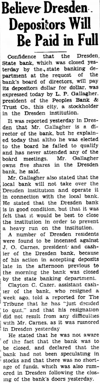 Depositors Will Be Paid in Confidence that the State bank, which was closed yesterday by the, state banking the request of the partment at bank's board of directors, will pay its depositors dollar for dollar. was today by Gallagher. expressed president of the Peoples Bank this city, stockholder Trust in the Dresden institution. was reported yesterday in Dresden that Mr. Gallagher rector of the bank. but he explained today that altho he was elected to the board he failed qualify and has never attended any of the board meetings. Mr. Gallagher owns five shares in the Dresden bank, he said. Mr. Gallagher also stated that the local bank will not take over the Dresden Institution and operate in connection with the local bank. He stated that the Dresden bank good condition. but that it was felt that would be best to close the institution in order to prevent heavy run on the institution. number Dresden residents found to be incensed against Carnes, president and cashof the Dresden bank. because of his action in accepting deposits in the afternoon previous to the morning the bank was closed by state banking department. Clayton Cazer. assistant cashof the bank. who resigned week told reported for The ago. Tribune that he has "just decided to and that his resignation did not result from any difficulties with Mr. Carnes. as it was rumored Dresden yesterday He stated that he was not aware the fact that the bank was be closed. and declared that the bank had not been speculating stocks and that there was no shortage of funds. which also rumDresden following the closof the bank's doors yesterday.