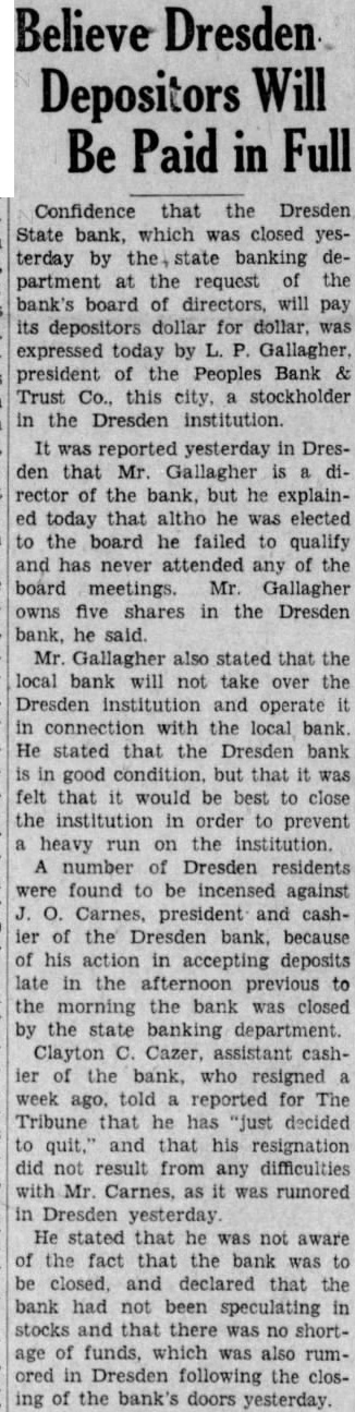 Depositors Will Be Paid in Confidence that the Dresden State bank, which was closed yesterday by banking partment at the request the bank's board of directors, will pay its depositors dollar for dollar. expressed today by Gallagher, president of the Peoples Bank Trust Co., this city, stockholder in the Dresden institution was reported yesterday in Dresden that Mr. Gallagher rector of the bank, but he explaintoday that altho he was elected the board he failed to qualify and has never attended any of the board meetings. Gallagher owns five shares in the Dresden he said. Mr. Gallagher also stated that the local bank will not take over the Dresden institution and operate connection with the local bank. stated that the Dresden bank in good but that was felt that would be best to close the institution in order to prevent heavy run on number of Dresden residents found to be incensed against Carnes, president and cashier of the Dresden bank, because his action in accepting deposits late in the afternoon previous to the morning the bank was closed by the state banking department. Clayton Cazer, assistant cashier of the bank, who resigned week ago, told reported for The Tribune that he has "just decided to and that his resignation did not result from any difficulties was rumored in Dresden yesterday He stated that he was not aware the fact that the bank was and declared that the bank had not been speculating stocks and that there was no shortfunds, which was also rumored in Dresden following the closing of the bank's doors yesterday.