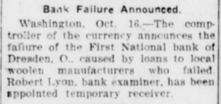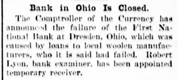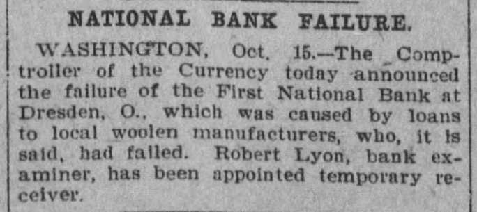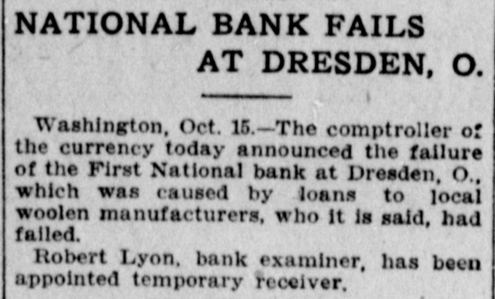 Multiple contemporaneous newspaper dispatches (Oct 15-16, 1907) report the First National Bank of Dresden, Ohio, was closed by the Comptroller and a receiver (bank examiner Robert Lyon/Lyons) appointed because of heavy loans to local woolen manufacturers who failed. No run or depositor panic is described in the articles; insolvency and receivership followed.