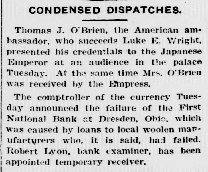 CONDENSED DISPATCHES. Thomas J. O'Brien, the American ambassador, who succeeds Luke E. Wright, presented his credentials to the Japanese Emperor at an audience in the palace Tuesday. At the same time Mrs. O'Brien was received by the Empress. The comptroller of the currency Tuesday announced the failure of the First National Bank at Dresden, Ohio. which was caused by loans to local woolen marufacturers who, it is said, had failed. Robert Lyon, bank examiner, has been appointed temporary receiver.