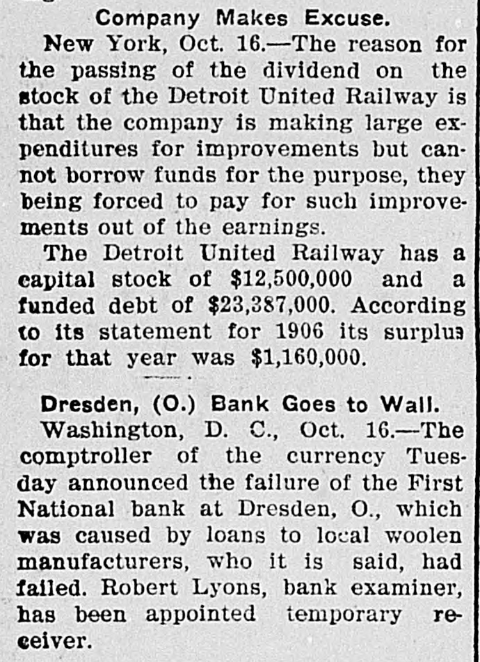 Company Makes Excuse. New York, Oct. 16.-The reason for the passing of the dividend on the stock of the Detroit United Railway is that the company is making large expenditures for improvements but cannot borrow funds for the purpose, they being forced to pay for such improvements out of the earnings. The Detroit United Railway has a capital stock of $12,500,000 and a funded debt of $23,387,000. According to its statement for 1906 its surplus for that year was $1,160,000. Dresden, (0.) Bank Goes to Wall. Washington, D. C., Oct. 16.-The comptroller of the currency Tuesday announced the failure of the First National bank at Dresden, 0., which was caused by loans to local woolen manufacturers, who it is said, had failed. Robert Lyons, bank examiner, has been appointed temporary receiver.