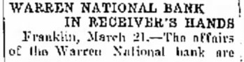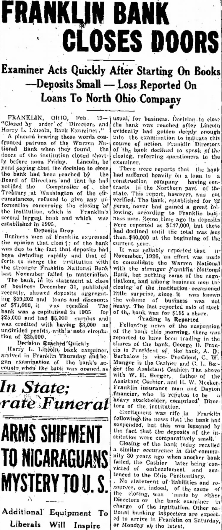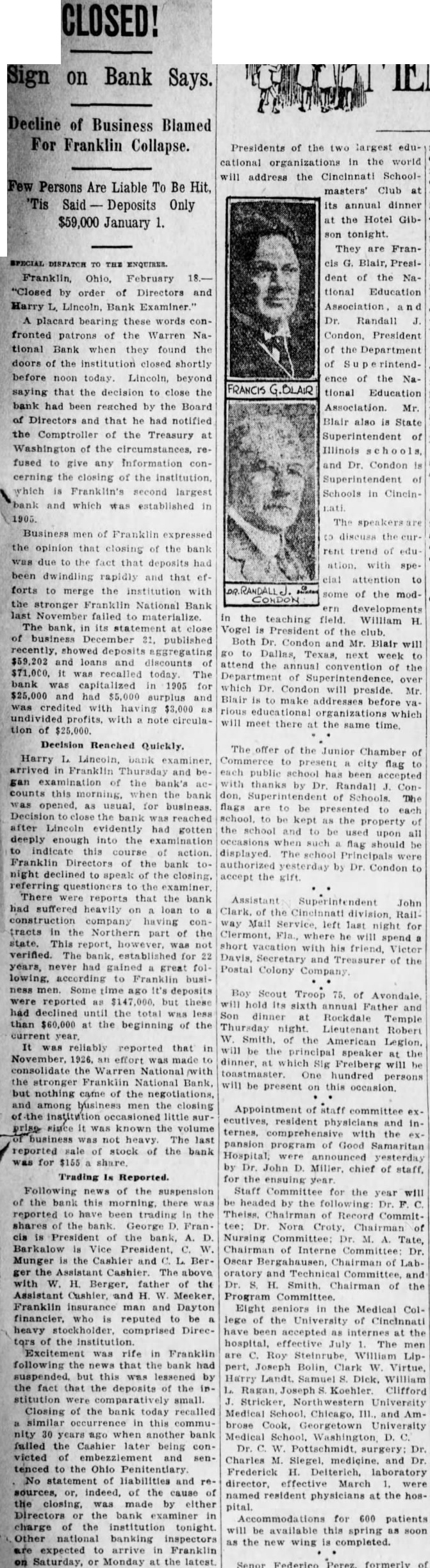 CLOSED! Sign on Bank Says. Decline of Business Blamed For Franklin Collapse. Persons Are Liable To Be Hit, "Tis Only $59,000 January 1. SPECIAL THE ENQUIRER. Blair, PresiOhio, February dent Na"Closed by order of Directors and tional Education Harry L. Lincoln, Bank Examiner. Association placard bearing words Dr. Randall fronted patrons of the Warren Na- President tional Bank when found the the Department doors of the institution closed shortly of before today. Lincoln, beyond the Nasaying that the decision to close the tional Education bank had reached by the Board Mr. Directors that had notified Blair State the Comptroller of the Treasury Washington the circumstances. Illinois fused to give any Information and Dr. Condon cerning closing the institution Superintendent which Franklin's second largest Schools Cincinwhich established The Business Franklin discuss opinion that closing the bank trend due the that deposits had been rapidly attention forts to the institution with some of the modNational the teaching William H. bank its Vogel December published and Mr. Blair will aggregating and loans attend the the $71,000. today The bank was capitalized 1905 for which Dr. will preside. Mr $25,000 and $5,000 and Blair credited $3,000 which profits, with circulameet the same time. $25,000. Decision The offer the Junior Chamber Harry city flag arrived and examination the thanks by the bank business. flags Decision reached school. the after Lincoln had gotten the school and upon deeply enough into flag indicate course action displayed Franklin Directors the bank by Dr. Condon night declined speak the closing. accept referring questioners examiner There reports that the bank Assistant had suffered loan company having Mail left last night tracts Northern part the where will spend was not short vacation with his friend, Victor verified. The for Secretary Treasurer of the years, had great fol- Postal Colony Company lowing. busiBoy Scout Troop of Avondale but these Its sixth annual Father had declined the was less Rockdale Temple $60,000 the beginning of the Thursday Lieutenant Robert American Legion. reliably that be the speaker November, 1926, dinner, Sig Freiberg consolidate hundred persons the stronger National Bank, be present this occasion. nothing came the men closing committee little known the volume was not The pansion Good Samaritan reported stock the bank for $155 by Dr. John Miller. chief of staff. Trading for the Following the the will this there by the Dr. reported the Theiss. of Record CommitNora Nursing Committee: Barkalow Munger the and Ber- Oscar Chairman of oratory and Technical and father the Smith. Chairman of the Program Committee. Franklin insurance man and Dayton Eight seniors the Medical Colreputed lege of heavy comprised Direcat the the hospital. The men Excitement was Franklin William Lipfollowing news that the bank pert, Joseph Bolin, Virtue. suspended. but lessened by Harry Samuel William the that the deposits of the Ragan, Koehler Clifford stitution small. Stricker, University Closing of the today recalled Medical School, Chicago, III., this commu- Cook, University nity years another bank Medical Washington fulled the Cashier being conPottschmidt surgery: Dr. victed embezzlement Charles medicine. Dr. tenced the Ohio Penitentiary. Frederick Delterich, laboratory No liabilities and director. March the named resident physicians at the by the in for 600 patients charge tonight. will available this spring banking inspectors the wing completed. expected Franklin Saturday, or Monday at the latest Senor Federico Perez, formerly