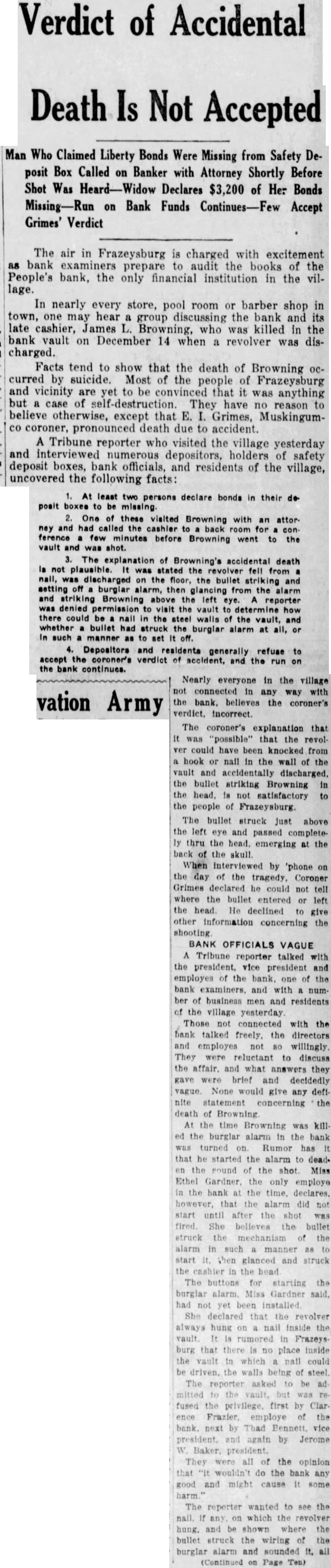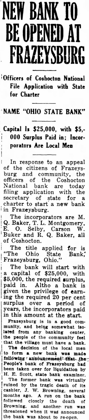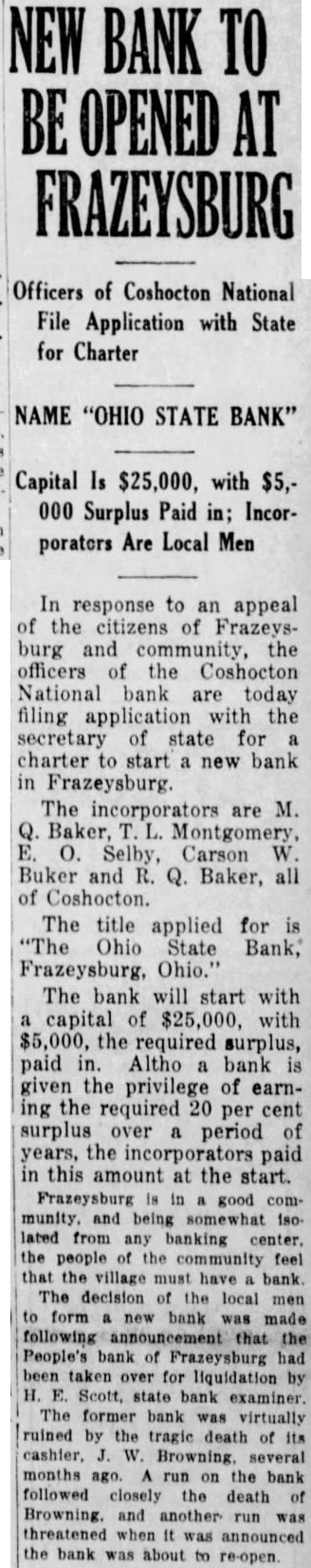 The People's bank at Frazeysburg has been closed indefinitely as a result of "run" of depositors who withdrew their savings following the tragic death James L. Browning, cashie of the bank, who was found dead in vault. Browning either shot himor, as the coroner, Grimes of Zanesville, said, was accidentally shot when he knocked revolver from its hanger in the bank vault, its fall discharging it, the bullet entering his head. Rumors have persisted Frazeysburg since the death of the banker,- that the wound might have been self inflicted, despite statements of President W. Baker and others that the condition of the bank was sound. Altho there is no apparent reason to doubt the coroner's verdict, these led to steady withdrawal of funds. and a demand that the state take hand. FUNDS BELIEVED SAFE State examiners been working at the bank for several days. according to reports from Frazeysburg. At the close of business Friday, business was suspended. H. Scott, state superintendent of banks, officially took charge. He issued the following state ment: