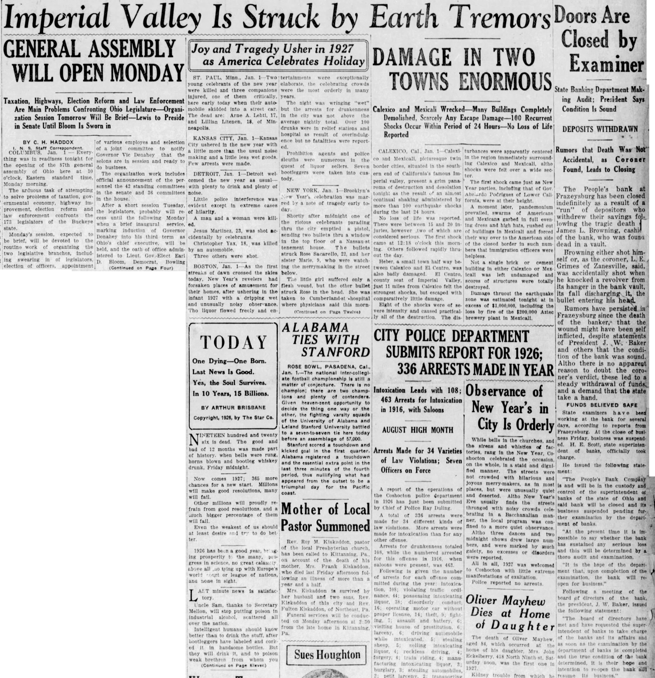 Doors Are Is Struck Earth Tremors Imperial Valley by Closed by GENERAL ASSEMBLY Joy and Tragedy Usher in 1927 DAMAGE IN TWO as America Celebrates Holiday Examiner WILL OPEN MONDAY ST. Jan. exceptionally TOWNS ENORMOUS celebrants of the the