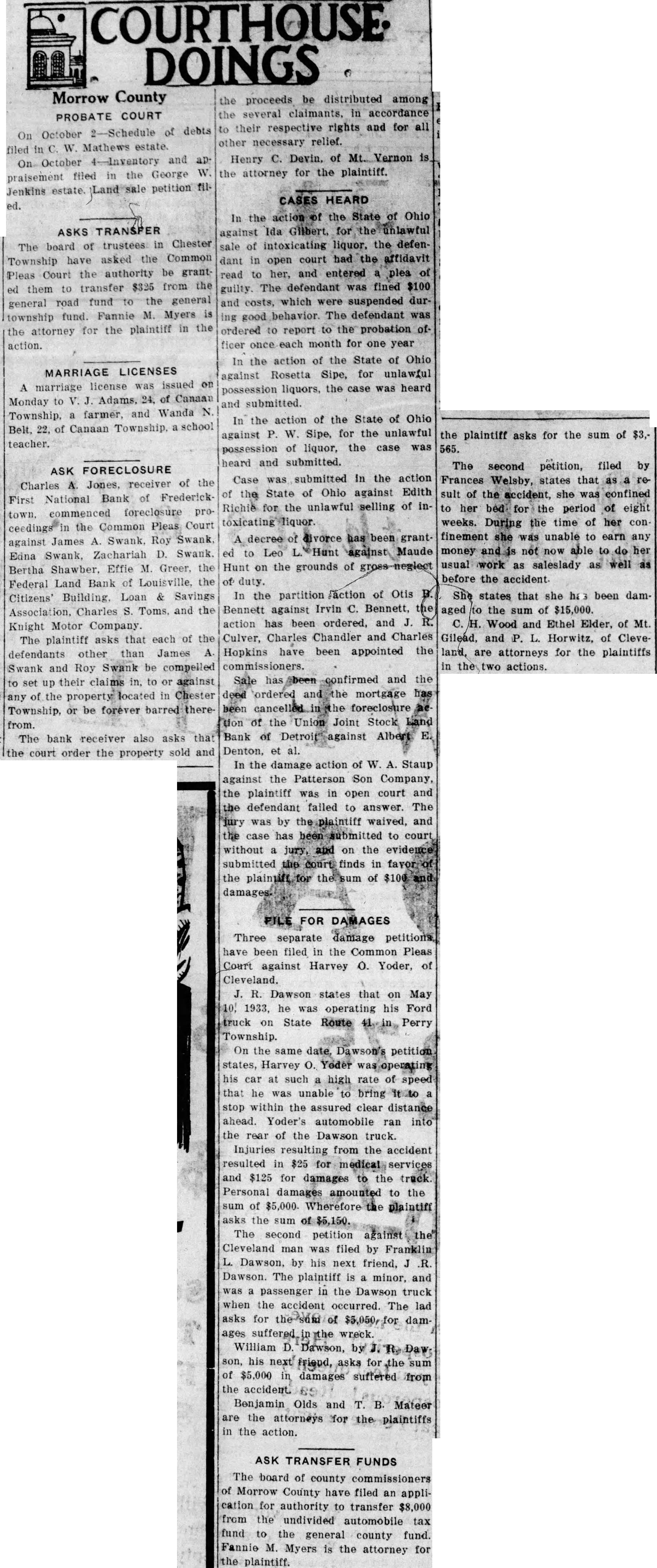COURTHOUSE DOINGS Morrow County PROBATE COURT On October 2-Schedule of debts filed in C. W. Mathews estate. On October 4-Inventory and ap praisement filed in the George W. Jenkins estate Land petition fil. ed. ASKS TRANSFER The board of trustees in Chester Township have asked the Common Pleas Court the authority be grant ed them to transfer $325 from the general road fund the general township fund. Fannie M. Myers is the attorney for the plaintiff in the action. MARRIAGE LICENSES A marriage license was issued on Monday to V. J. Adams, 24. of Canaau Township. a farmer, and Wanda N. Belt, 22, of Canaan Township. school teacher. ASK FORECLOSURE Charles A. Jones, receiver of the First National Bank of Frederick town. commenced foreclosure proceedings in the Common Pleas Court against James A. Swank, Roy Swank, Edna Swank, Zachariah D. Swank. Bertha Shawber. Effie M. Greer, the Federal Land Bank of Louisville, the Citizens' Building. Loan & Savings Association, Charles S. Toms. and the Knight Motor Company. The plaintiff asks that each of the defendants other than James A Swank and Roy Swank be compelled to set up their claims in, to or against any of the property located in Chester Township, or be forever barred therefrom. The bank receiver also asks that the court order the property sold and the proceeds be distributed among the several claimants, in accordance to their respective rights and for all other necessary relief. Henry C. Devin. of Mt... Vernon is the attorney for the plaintiff. CASES HEARD In the action of the State of Ohio against Ida Gilbert, for the unlawful sale of intoxicating liquor. the defendant in open court had the affidavit read to her, and entered a plea of guilty. The defendant was fined $100 and costs, which were suspended during good behavior. The defendant was ordered to report to the probation of ficer once each month for one year In the action of the State of Ohio against Rosetta Sipe, for unlawful possession liquors, the case was heard and submitted. In the action of the State of Ohio against P. W. Sipe, for the unlawful possession of liquor, the case was heard and submitted. Case was submitted in the action of the State of Ohio against Edith Richie for the unlawful selling of intoxicating liquor decree divorce has been granted to Leo Hunt against Maude Hunt on the grounds of gross neglect of duty. In the partition action of Otis Bennett against Irvin C. Bennett, the action has been ordered, and J. R. Culver, Charles Chandler and Charles Hopkins have been appointed the Sale has been confirmed and the deed ordered and the mortgage has been cancelled in the foreclosure ac tion of the Union Joint Stock Land Bank of Detroit against Albert E. Denton, et al. In the damage action of W. A. Staup against the Patterson Son Company, the plaintiff was in open court and the defendant failed to answer. The jury was by the plaintiff waived, and the case has been submitted to court without a jury, and on the evidence submitted the court finds in favor of the plaintiff of and damages. FILE FOR DAMAGES Three separate damage petitions have been filed in the Common Pleas Court against Harvey O. Yoder, of Cleveland. J. R. Dawson states that on May 10. 1933, he was operating his Ford truck on State Route 41.in Perry Township. On the same date, Dawson's petition states, Harvey O. Yoder was-operating his car at such a high rate of speed that he was unable to bring it to a stop within the assured clear distance ahead. Yoder's automobile ran into the rear of the Dawson truck. Injuries resulting from the accident resulted in $25 for edical services and $125 for damages to the truck Personal damages amounted to the sum of $5,000. Wherefore the plaintiff asks the sum $5,150. The second petition against the Cleveland man was filed by Franklin L. Dawson. by his next friend, J R Dawson. The plaintiff is a minor, and was a passenger in the Dawson truck when the accident occurred. The lad asks for the sum of $5,050, for damages suffered in the wreck. William D. Dawson, by J. Re Daw. son, his next friend, asks for the sum of $5,000 in damages suffered from the accident Benjamin Olds and T. B. Mateer are the attorneys for the plaintiffs in the action. ASK TRANSFER FUNDS The board of county commissioners of Morrow County have filed an application for authority to transfer $8,000 from the undivided automobile tax fund to the general county fund. Fannie M. Myers is the attorney for the plaintiff. the plaintiff asks for the sum of $3,565. The second petition, filed by Frances Welsby, states that as a result of the accident, she was confined to her bed for the period of eight weeks. During the time of her confinement she was unable to earn any money and not now able to do her usual work as saleslady as well as before the accident She states that she ha been damaged to the sum of $15,000. C.H. Wood and Ethel Elder, of Mt. Gilead, and P. L. Horwitz, of Cleveland, are attorneys for the plaintiffs in the two actions.
