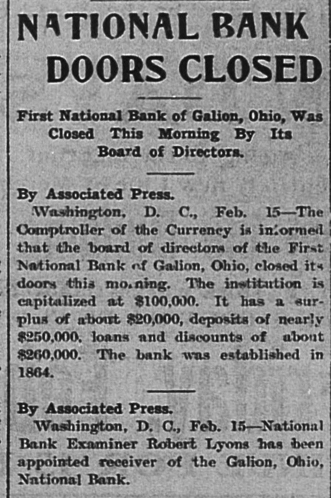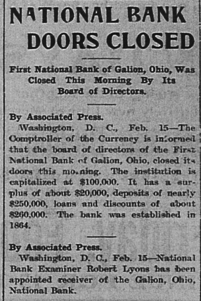 NATIONAL BANK DOORS CLOSED First National Bank of Galion, Ohio, Was Closed This Morning By Its Board of Directors. By Associated Press. Washington, D. C., Feb. 15-The Comptroller of the Currency is informed that the board of directors of the First National Bank of Galion, Ohio, closed its doors this mo.ning. The institution is capitalized at $100,000. It has a surplus of about $20,000, deposits of nearly $250,000, loans and discounts of about $260,000. The bank was established in 1864. By Associated Press. Washington, D. C., Feb. 15-National Bank Examiner Robert Lyons has been appointed receiver of the Galion, Ohio, National Bank.