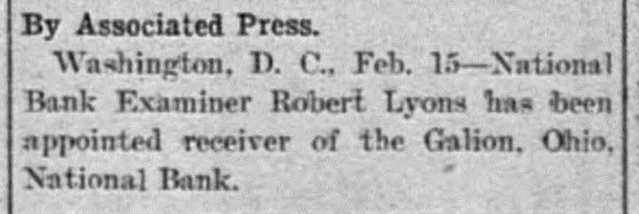 By Associated Press. Washington, D. C., Feb. 15-National Bank Examiner Robert Lyons has been appointed receiver of the Galion, Ohio. National Bank.