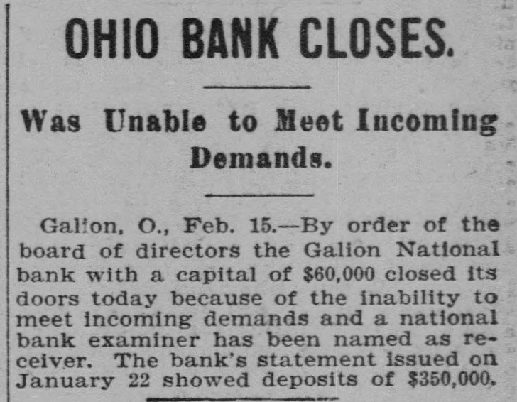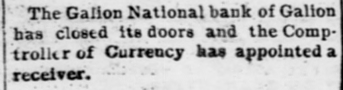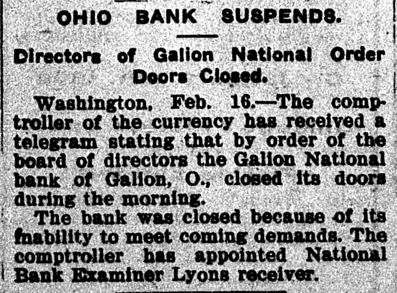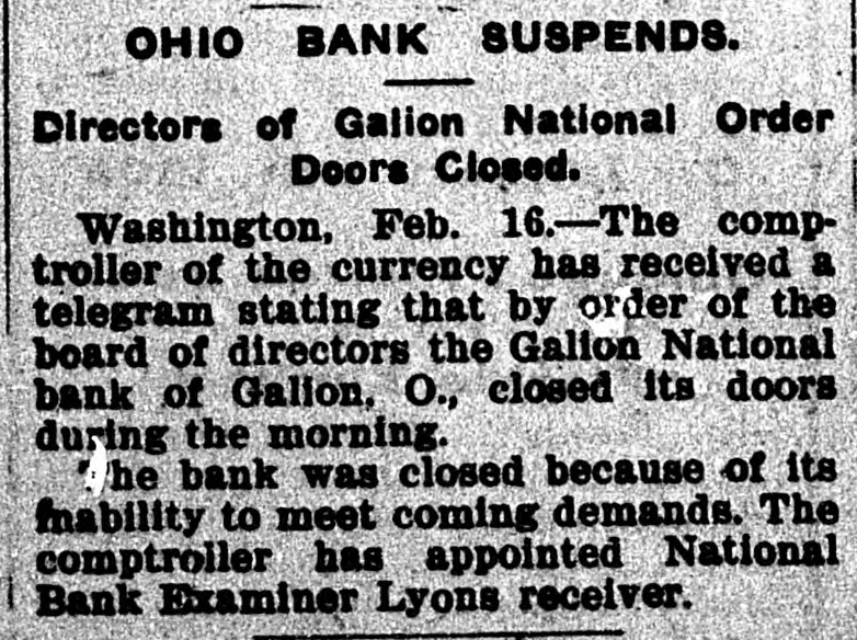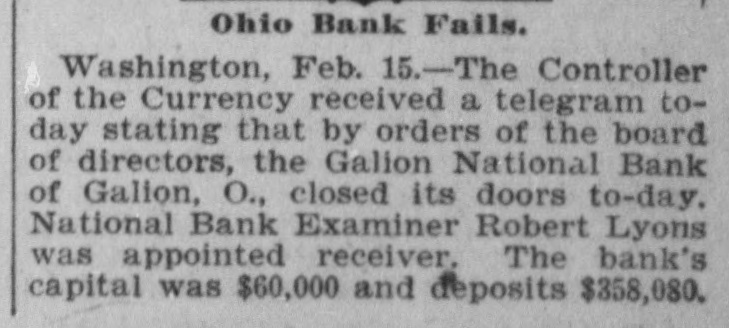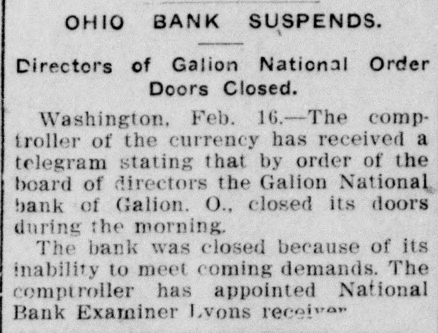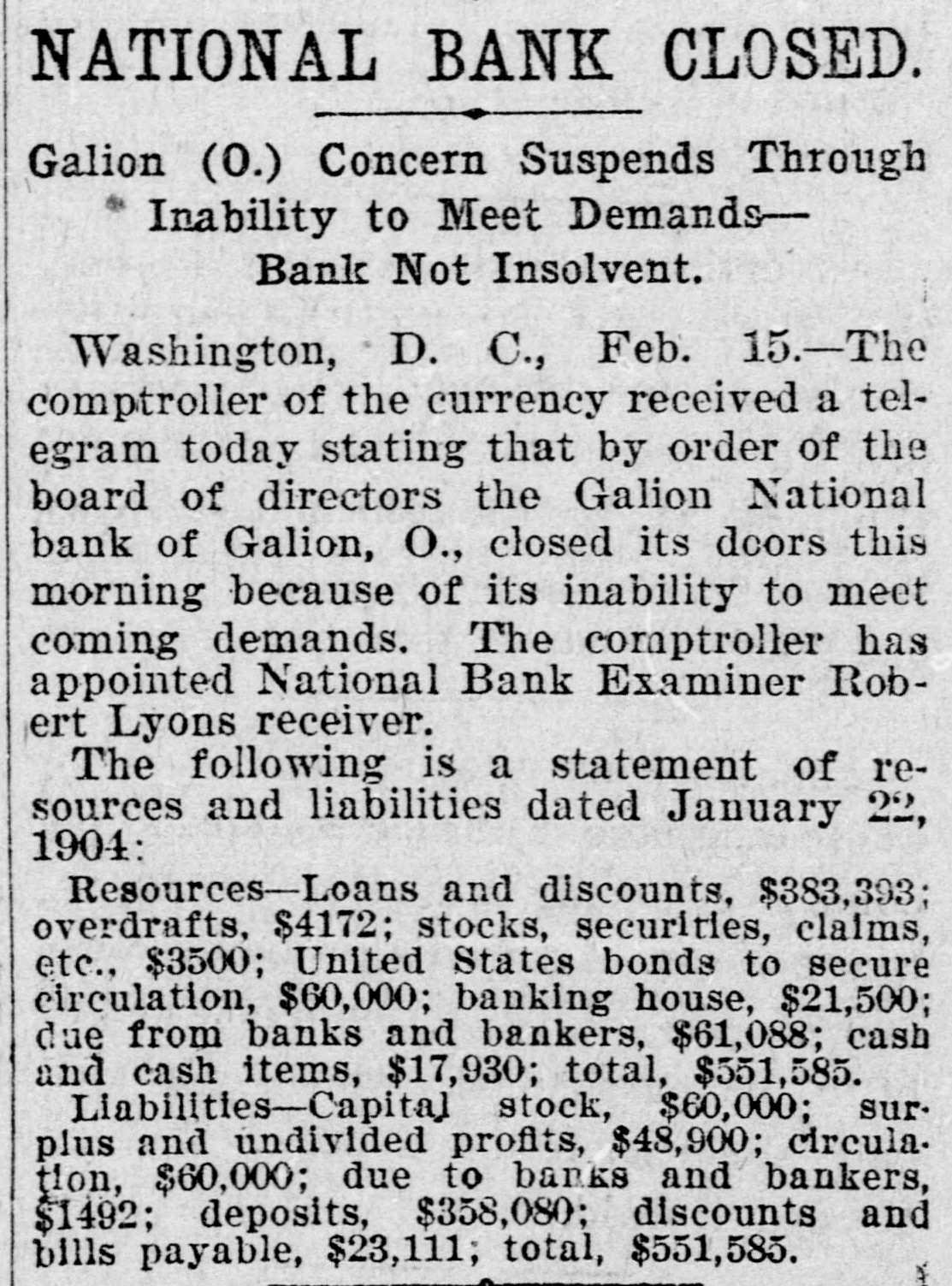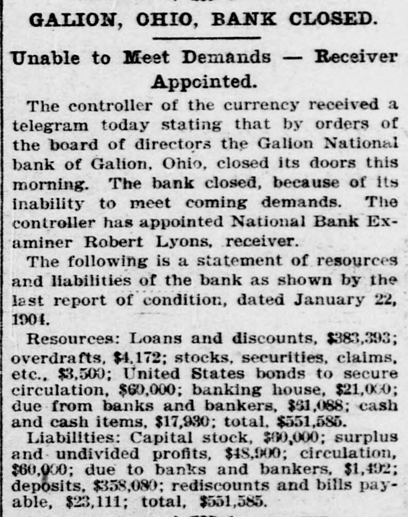GALION, OHIO, BANK CLOSED. Unable to Meet Demands - Receiver Appointed. The controller of the currency received a telegram today stating that by orders of the board of directors the Galion National bank of Galion, Ohio, closed its doors this morning. The bank closed, because of its inability to meet coming demands. The controller has appointed National Bank Examiner Robert Lyons, receiver. The following is a statement of resources and liabilities of the bank as shown by the last report of condition, dated January 22, 1904. Resources: Loans and discounts, $383,393; overdrafts, $4,172; stocks, securities, claims, etc., $3,500; United States bonds to secure circulation, $60,000; banking house, $21,000; due from banks and bankers, $61,088; cash and cash items, $17,930; total. $551,585. Liabilities: Capital stock, $60,000; surplus and undivided profits, $48,900; circulation, $60,000; due to banks and bankers, $1,492; deposits, $358,080; rediscounts and bills payable, $23,111; total, $551,585.