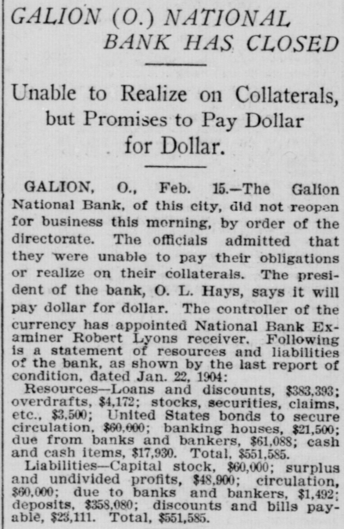 GALION (0.) NATIONAL BANK HAS CLOSED Unable to Realize on Collaterals, but Promises to Pay Dollar for Dollar. GALION, O., Feb. 15.-The Galion National Bank, of this city, did not reopen for business this morning, by order of the directorate. The officials admitted that they were unable to pay their obligations or realize on their collaterals. The president of the bank, O. L. Hays, says it will pay dollar for dollar. The controller of the currency has appointed National Bank Examiner Robert Lyons receiver. Following is a statement of resources and liabilities of the bank, as shown by the last report of condition, dated Jan. 22, 1904: Resources-Loans and discounts, $383,393; overdrafts, $4,172; stocks, securities, claims, etc., $3,500; United States bonds to secure circulation, $60,000; banking houses, $21,500; due from banks and bankers, $61,088; cash and cash items, $17,930. Total, $551,585. Liabilities-Capital stock, $60,000; surplus and undivided profits, $48,900; circulation, $60,000; due to banks and bankers, $1,492; deposits, $358,080; discounts and bills payable, $23,111. Total, $551,585.