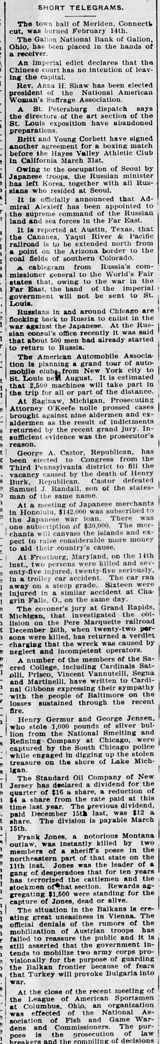SHORT TELEGRAMS. The town hall of Meriden, Connectb cut, was burned February 14th. Galion National Bank of Galion, of Ohio, The has been placed in the hands a receiver. imperial edict declares that leav- the Chinese An court has no intention of ing the capital. Anna H. Shaw has been elected Rev. of the National American Woman's president Suffrage Association. St. Petersburg dispatch of says the A directors of the art section abandoned the St. Louis exposition have preparations. and Young Corbett have signed match Britt agreement for a boxing Club before another the Hayes Valley Athletic in California March 31st. I Owing to the occupation of Seoul minister by troops, the Russian all Rushas Japanese left Korea, together with sians who resided at Seoul. is officially announced that Ad- to It Alexieff has been appointed Russian miral command of the East. the sea forces in the land supreme and Far Texas, that reported at Austin, Pacific It Cananea, is Yaqui River north & from the is to be extended to the railroad on the Arizona Colorado. border coal a point fields of southern 3 cablegram from Russia's World's com- Fair missioner A general to the war in the 1 that, owing to the imperial government Far states East. the will band not of be the sent to St. Louis. Russians in and around enlist Chicago in the are back to Russia to the Rusflocking against the Japanese. At it was said I war consul's office recently started sian that about 500 men had already to return to Russia. Automobile Associa tion The is American planning clubs from a grand New York tour estimated of city auto- to mobile Louis next August. It take is part in St. 2,500 machines will distance. 1 that for all or part of the e the At trip Saginaw, Michigan, Prosecuting cases Attorney O'Keefe nolle prossed and exagainst nine aidermen indictments brought the result of S aldermen as the recent grand jury. Int 9 returned sufficient by evidence was the prosecutor's t to g reason. George A. Castor, Congress Republican, from has the the S been elected Pennsylvania district to of fill Henry Third caused by the death defeated . vacancy Republican. Castor states5 e 8 Samuel Burk, J. Randall, son of the of the same name. h man At Honolulu, a meeting $142,000 of Japanese was subscribed There merchanta was to in the Japanese war $30,000. loan. The merraise chants one subscription will canvass considerable of the islands more and money expect to aid to their country's cause. 14th Frostburg, Maryland, on and the inst., At two persons twenty-five were killed seriously. sev- ran enty-five injured. accident. The car I in a trolley steep car grade. Sixteen at were Chaaway on in a a similar accident 1 t injured Falls, O., on the same day. grin jury at Grand the Rapids, collision on when twenty-two t h t e Michigan, December The coroner's the 26th, that Pere investigated Marquette returned railroad verdict perwere killed. has caused a by h sons charging that the wreck was operators. e - neglect and incompetent members of the SaA number of the Cardinals Sate College, including Vannutelli, Segna e 1 olli, cred Martinelli, Prisco, Vincent have written sympathy to Cardiand Gibbons expressing their on the V losses 1 with nal the sustained people of through Baltimore the recent h fire. Germur and George of silver Jensen, bulHenry stole 1,000 pounds Smelting and who the National were lion from Company at Chicago, police e 8 8 treasure Refining captured while engaged on by the the in South shore digging of Chicago up Lake the stolen Michigan. Standard Oil Company of for New the The has declared a dividend reduction of 1 Jersey of $16 is share, a paid at this last year. 1 e quarter $4 a share from The the previous rate dividend. a was $12 1 15th. t S time share. paid December The division 15th is last, payable March . Frank Jones, a notorious killed Montana by two h e outlaw, was instantly a sheriff's posse in the the part of that leader of northeastern members of Jones was the state on a inst. for ten years 1 h a d e h 11th gang has terrorized of desperadoes the section. cattlemen that Rewards and ag- the stockmen $1,500 hat were standing alive. for the 1 gregating of Jones, dead or capture The situation in the Balkans in Vienna. is The cregreat uneasiness rumors of the 1 h ating denials of the troops has 8 official of Austrian and it is 1 1 failed to that the mobilization asserted reassure the public government corps pro- ine still mobilize two army of guarding 1 visionally tends to for the purpose because of fears . e , s the that Balkan Turkey will frontier provoke Bulgaria into 8 of war. At League the close of of American the recent organization meeting Sportsmen was the Columbus. Ohio. an National Ase Fish e at effected of the and Game Ware sociation and of Commissioners. The of pur- law dens prosecution 1 breakers pose is and the the compiling of decisions