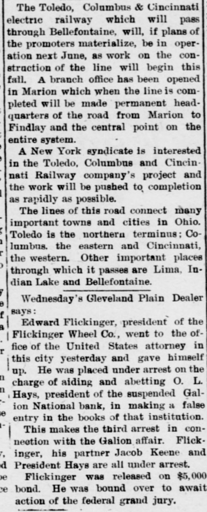 The Toledo, Columbus & Cincinnati electric railway which will pass through Bellefontaine, will, if plans of the promoters materialize, be in operation next June, as work on the construction of the line will begin this fall. A branch office has been opened in Marion which when the line is completed will be made permanent headquarters of the road from Marion to Findlay and the central point on the entire system. A New York syndicate is interested in the Toledo, Columbus and Cincinnati Railway company's project and the work will be pushed to completion as rapidly as possible. The lines of this road connect many important towns and cities in Ohio. Toledo is the northern terminus; Columbus, the eastern and Cincinnati, the western. Other important places through which it passes are Lima, Indian Lake and Bellefontaine. Wednesday's Cleveland Plain Dealer says: Edward Flickinger, president of the Flickinger Wheel Co., went to the office of the United States attorney in this city yesterday and gave himself up. He was placed under arrest on the charge of aiding and abetting O. L. Hays, president of the suspended Galion National bank, in making a false entry in the books of that institution. This makes the third arrest in connection with the Galion affair. Flickinger, his partner Jacob Keene and President Hays are all under arrest. Flickinger was released on $5,000 bond. He was bound over to await action of the federal grand jury.