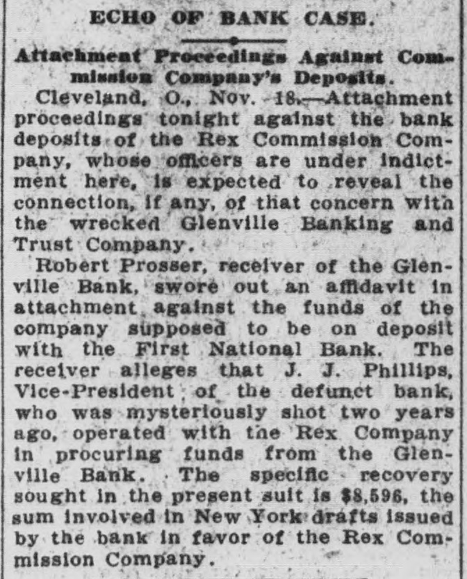 ECHO OF BANK CASE. Attachment Proceedings Against Commission Company's Deposits. Cleveland, O., Nov. 18.-Attachment proceedings tonight against the bank deposits of the Rex Commission Company, whose officers are under indictment here, is expected to reveal the connection, If any, of that concern with the wrecked Glenville Banking and Trust Company. Robert Prosser, receiver of the Glenville Bank, swore out an affidavit in attachment against the funds of the company supposed to be on deposit with the First National Bank. The receiver alleges that J. J. Phillips, Vice-President of the defunct bank, who was mysteriously shot two years ago, operated with the Rex Company in procuring funds from the Glenville Bank. The specific recovery sought in the present suit is $8,596, the sum involved in New York drafts issued by the bank in favor of the Rex Commission Company.