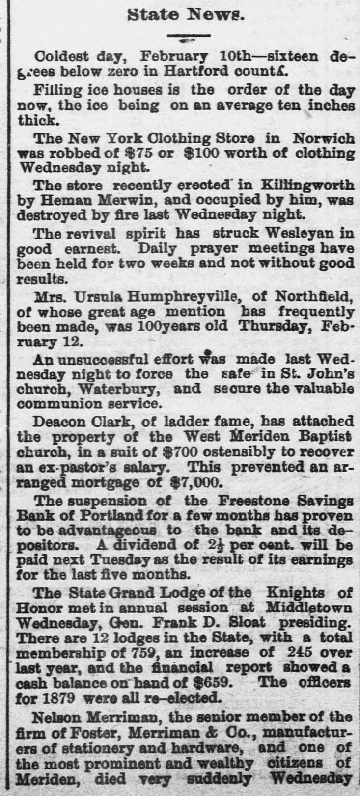 State News. Coldest day, February 10th-sixteen degrees below zero in Hartford count&. Filling ice houses is the order of the day now, the ice being on an average ten inches thick. The New York Clothing Store in Norwich was robbed of $75 or $100 worth of clothing Wednesday night. The store recently erected in Killingworth by Heman Merwin, and occupied by him, was destroyed by fire last Wednesday night. The revival spirit has struck Wesleyan in good earnest. Daily prayer meetings have been held for two weeks and not without good results. Mrs. Ursula Humphreyville, of Northfield, of whose great age mention has frequently been made, was 100years old Thursday, February 12. An unsuccessful effort was made last Wednesday night to force the safe in St. John's church, Waterbury, and secure the valuable communion service. Deacon Clark, of ladder fame, has attached the property of the West Meriden Baptist church, in a suit of $700 ostensibly to recover an ex-pastor's salary. This prevented an arranged mortgage of $7,000. The suspension of the Freestone Savings Bank of Portland for a few months has proven to be advantageous to the bank and its depositors. A dividend of 21 per cent. will be paid next Tuesday as the result of its earnings for the last five months. The State Grand Lodge of the Knights of Honor met in annual session at Middletown Wednesday, Gen. Frank D. Sloat presiding. There are 12 lodges in the State, with a total membership of 759, an increase of 245 over last year, and the financial report showed a cash balance on hand of $659. The officers for 1879 were all re-elected. Nelson Merriman, the senior member of the firm of Foster, Merriman & Co., manufacturers of stationery and hardware, and one of the most prominent and wealthy citizens of Meriden, died very suddenly Wednesday