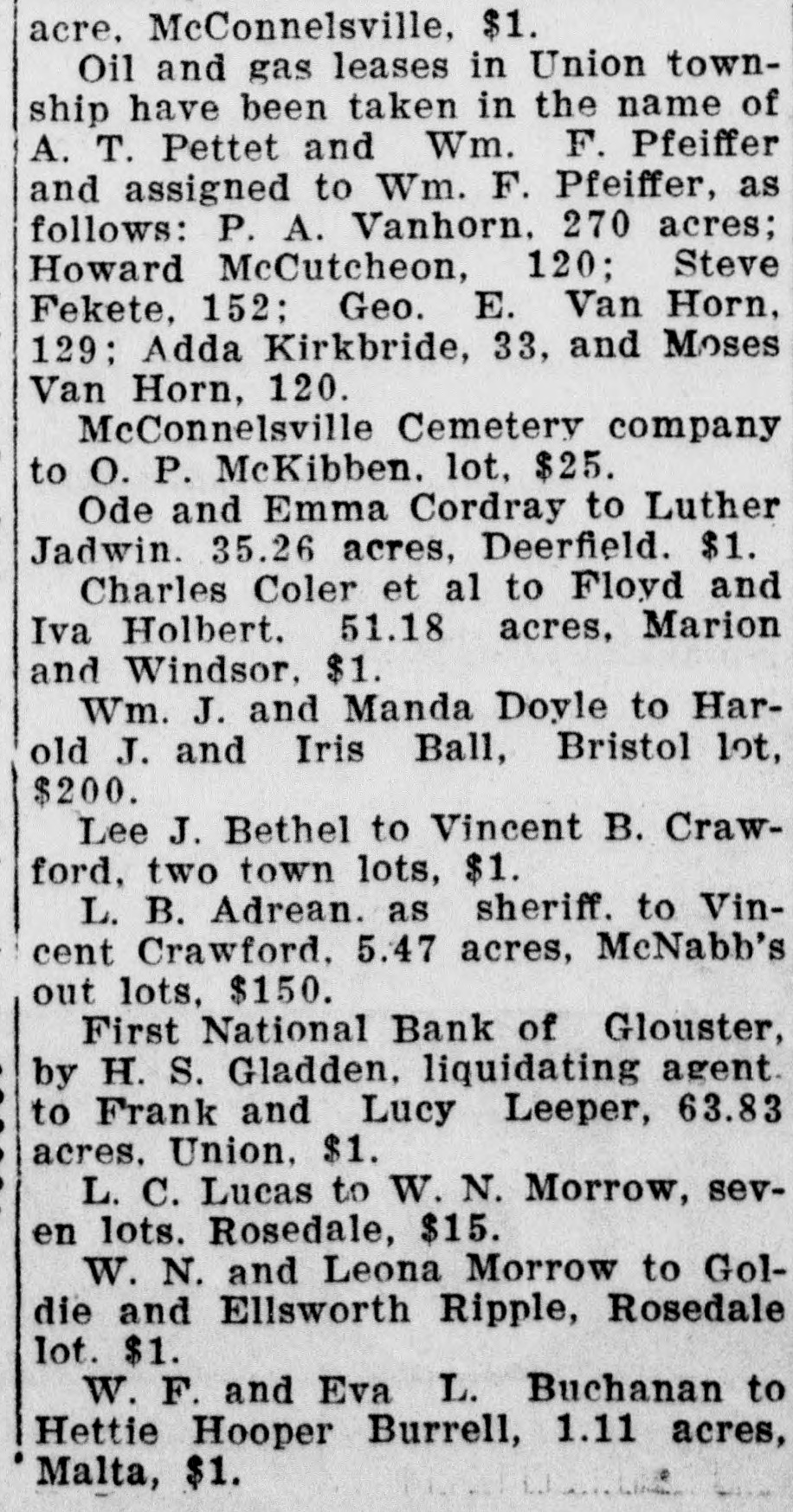acre. McConnelsville, $1. Oil and gas leases in Union township have been taken in the name of A. T. Pettet and Wm. F. Pfeiffer and assigned to Wm. F. Pfeiffer, as follows: P. A. Vanhorn. 270 acres; Howard McCutcheon, 120; Steve Fekete, 152; Geo. E. Van Horn, 129; Adda Kirkbride, 33, and Moses Van Horn, 120. McConnelsville Cemetery company to O. P. McKibben. lot, $25. Ode and Emma Cordray to Luther Jadwin. 35.26 acres, Deerfield. $1. Charles Coler et al to Floyd and Iva Holbert. 51.18 acres, Marion and Windsor, $1. Wm. J. and Manda Doyle to Harold J. and Iris Ball, Bristol lot, $200. Lee J. Bethel to Vincent B. Crawford, two town lots, $1. L. B. Adrean. as sheriff. to Vincent Crawford. 5.47 acres, McNabb's out lots, $150. First National Bank of Glouster, by H. S. Gladden, liquidating agent. to Frank and Lucy Leeper, 63.83 acres. Union, $1. L. C. Lucas to W. N. Morrow, seven lots. Rosedale, $15. W. N. and Leona Morrow to Goldie and Ellsworth Ripple, Rosedale lot. $1. W. F. and Eva L. Buchanan to Hettie Hooper Burrell, 1.11 acres, Malta, $1.