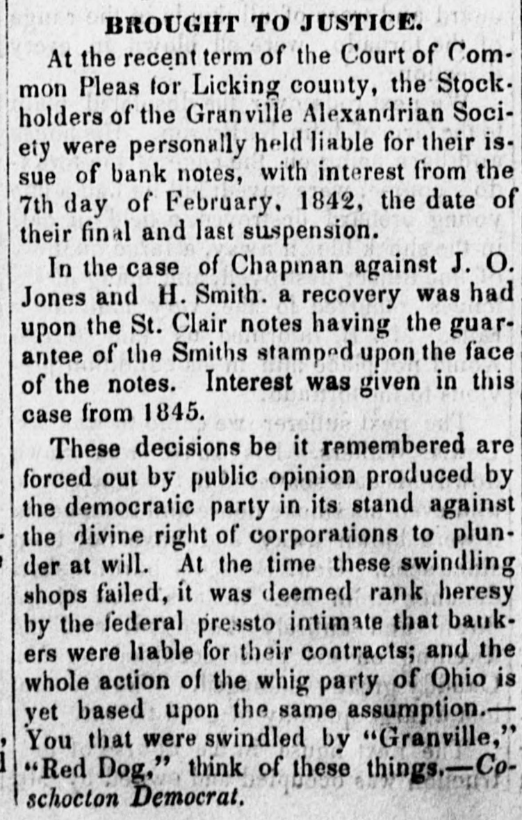 BROUGHT TO JUSTICE. At the recent term of the Court of Common Pleas for Licking county, the Stock. holders of the Granville Alexandrian Society were personally held liable for their issue of bank notes, with interest from the 7th day of February. 1842, the date of their final and last suspension. In the case of Chapman against J. O. Jones and H. Smith. a recovery was had upon the St. Clair notes having the guarantee of the Smiths stamped upon the face of the notes. Interest was given in this case from 1845. These decisions be it remembered are forced out by public opinion produced by the democratic party in its stand against the divine right of corporations to plunder at will. At the time these swindling shops failed, it was deemed rank heresy by the federal pressto intimate that baukers were liable for their contracts; and the whole action of the whig party of Ohio is yet based upon the same assumption.You that were swindled by "Granville," "Red Dog," think of these things.-Cpschocton Democrat.