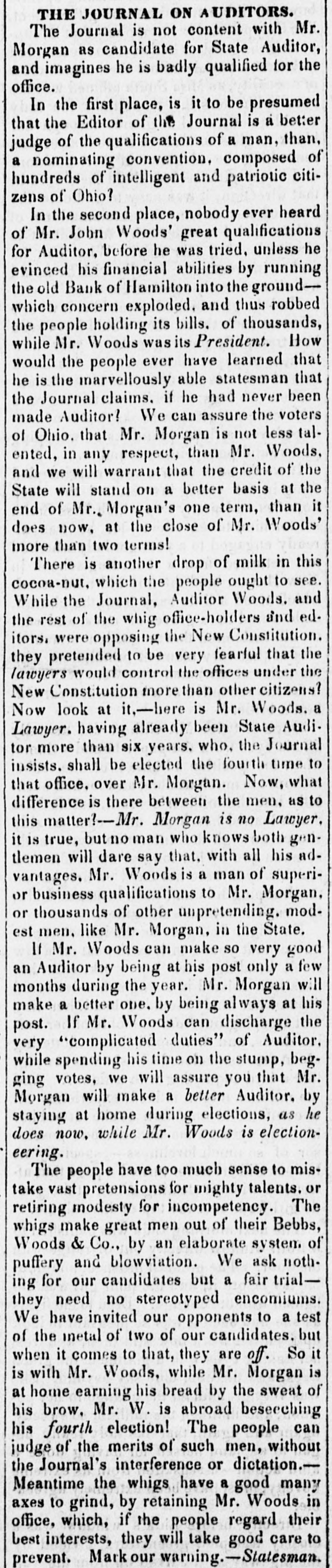 # THE JOURNAL ON AUDITORS. The Journal is not content with Mr. Morgan as candidate for State Auditor, and imagines he is badly qualified for the office. In the first place, is it to be presumed that the Editor of the Journal is a better judge of the qualifications of a man, than, a nominating convention, composed of hundreds of intelligent and patriotic citizens of Ohio? In the second place, nobody ever heard of Mr. John Woods' great qualifications for Auditor, before he was tried, unless he evinced his financial abilities by running the old Bank of Hamilton into the ground-which concern exploded, and thus robbed the people holding its bills of thousands, while Mr. Woods was its President. How would the people ever have learned that he is the marvellously able statesman that the Journal claims, if he had never been made Auditor? We can assure the voters of Ohio, that Mr. Morgan is not less talented, in any respect, than Mr. Woods, and we will warrant that the credit of the State will stand on a better basis at the end of Mr. Morgan's one term, than it does now, at the close of Mr. Woods' more than two terms! There is another drop of milk in this cocoa-nut, which the people ought to see. While the Journal, Auditor Woods, and the rest of the whig office-holders and editors, were opposing the New Constitution, they pretended to be very fearful that the lawyers would control the offices under the New Constitution more than other citizens? Now look at it,—here is Mr. Woods, a Lawyer, having already been State Auditor more than six years, who, the Journal insists, shall be elected the fourth time to that office, over Mr. Morgan. Now, what difference is there between the men, as to this matter?—Mr. Morgan is no Lawyer, it is true, but no man who knows both gentlemen will dare say that, with all his advantages, Mr. Woods is a man of superior business qualifications to Mr. Morgan, or thousands of other unpretending, modest men, like Mr. Morgan, in the State. If Mr. Woods can make so very good an Auditor by being at his post only a few months during the year, Mr. Morgan will make a better one, by being always at his post. If Mr. Woods can discharge the very "complicated duties" of Auditor, while spending his time on the stump, begging votes, we will assure you that Mr. Morgan will make a better Auditor, by staying at home during elections, as he does now, while Mr. Woods is electioneering. The people have too much sense to mistake vast pretensions for mighty talents, or retiring modesty for incompetency. The whigs make great men out of their Bebbs, Woods & Co., by an elaborate system of puffery and blowviation. We ask nothing for our candidates but a fair trial—they need no stereotyped encomiums. We have invited our opponents to a test of the metal of two of our candidates, but when it comes to that, they are off. So it is with Mr. Woods, while Mr. Morgan is at home earning his bread by the sweat of his brow, Mr. W. is abroad beseeching his fourth election! The people can judge of the merits of such men, without the Journal's interference or dictation.—Meantime the whigs have a good many axes to grind, by retaining Mr. Woods in office, which, if the people regard their best interests, they will take good care to prevent. Mark our warning.—Statesman.