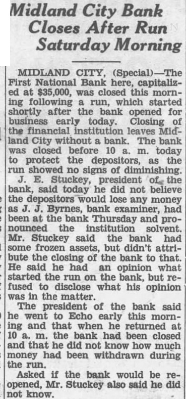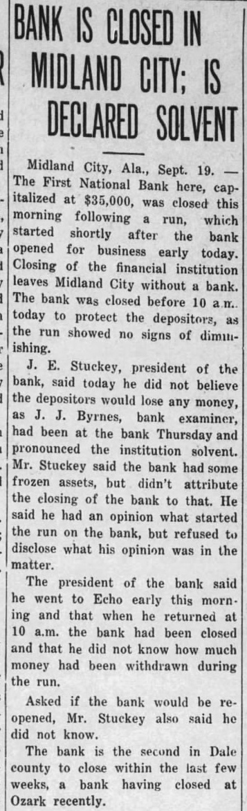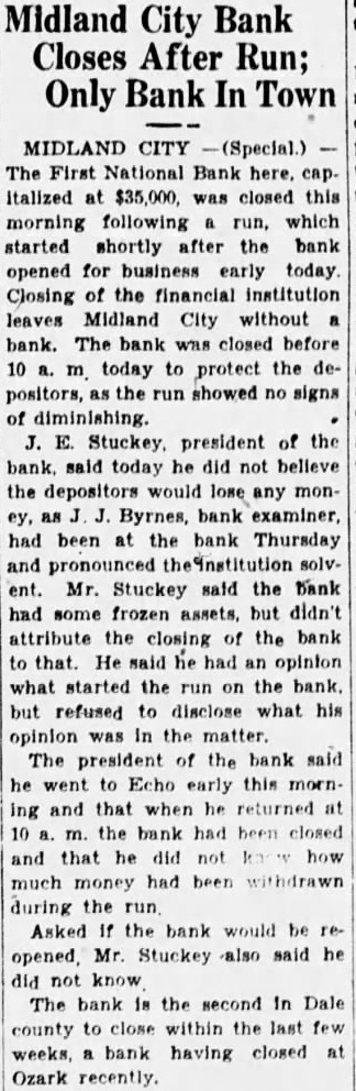 Midland City Bank Closes After Run; Only Bank In Town MIDLAND The First National Bank was closed morning following which started shortly after the bank opened for business early Closing the financial institution leaves Midland City without bank. The bank closed before 10 today protect the positors, the run showed no signs diminishing. E. president of the bank. said today he did not believe the depositors would monByrnes, bank examiner, had been at the bank Thursday and pronounced the Institution ent. Mr. Stuckey said the bank had frozen but didn't attribute the closing of the bank to He said he had opinion what started the run on the but refused to disclose what his opinion the matter. The president of the bank said he went Echo early this and that when returned the bank had been closed and that he did how much money had been withdrawn during the run Asked the bank would be Stuckey also said did not know The bank the second Dale county to close within the last few weeks, bank having closed Ozark recently.