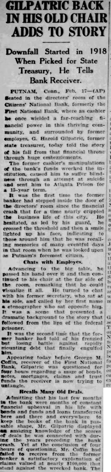GILPATRIC BACK IN CHAIR ADDS TO STORY Downfall Started in 1918 When Picked for State Treasury, He Tells Bank Receiver. PUTNAM. Conn., Feb. 17-(AP) Seated in directors' room the Citizens' National Bank, formerly the First National Bank, where as cashier once wielded far-reaching financial power in this thriving community, and surrounded by former employes, G. Harold Gilpatric, former state today told the story his fall from that financial throne through huge embezzlements. former cashier's bank's funds the institution, to suffer blindthrough an attempt suicide Atlanta Prison for the first time the former had inside the of the since the financial that for time crippled the this He as led by his guard, he crossed the and smile lighted up his face, around him that he ing of many days in that room he was looked upon Chats with Employes. Advancing the big passed his hand then continued to his chair the far side room. remarking that could visualize all. He turned to chat his former secretary, sat called by stenographer sat opposite him. scene that presented dramatic the story that followed from the lips of the federal prisoner. It was the time that the forbanker had frenzied against rapidly mounting debt that finally enguifed Appearing today before George M. Coffin, First Bank. Gilpatric questioned for notes, trust funds the receiver trying to Recalls Many Old Deals. Admitting that last few months the bank constant financial upheaval his bonds funds and loans transferred and there and to keep the books Mr. amazing the durpreceding the bank crash. the four Mr. Coffin failed to receive former claims valued nearly $100,000 that against the bank. The