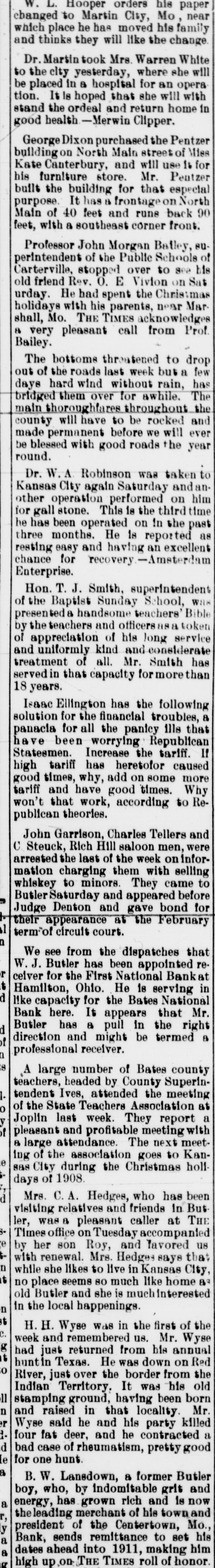 W. L. Hooper orders his paper changed to Martin City, Mo near which place he has moved his family and thinks they will like the change Dr. Martin took Mrs. Warren White to the city yesterday, where she will be placed in a hospital for an opera tion. It ls hoped that she will with stand the ordeal and return home in good health -Merwin Clipper. George Dixon purchased the Pentzer building on North Main street of Miss Kate Canterbury, and will use 16 for his furniture store. Mr. Pentzer built the building for that especial purpose. It has 8 frontage on North Main of 40 feet and runs back 90 feet, with a southeast corner front. Professor John Morgan Batley, superintendent of the Public Schools of Carterville, stopped over to see bis old friend Rev. O. E Vivion on Sat urday. He had spent the Christmas holidays with his parents, near Mar. shall, Mo. THE TIMES acknowledges & very pleasant call from Prof. Bailey. The bottoms threatened to drop out of the roads last week but a few days hard wind without rain, has bridged them over for awhile. The main thoroughfares throughout the county will have to be rocked and made permanent before we will ever be blessed with good roads the year round. Dr. W. Robinson was taken to Kansas City again Saturday and another operation performed on him for gall stone. This is the third time he has been operated on In the past three months. He is reported as resting easy and having an excellent chance for recovery.-Amsterdam Enterprise. Hon. T. J. Smith, superintendent of the Baptist Sunday School, WHS presented a handsome teachers' Bible by the teachers and officers a token of appreciation of his long service and uniformly kind and considerate treatment of all. Mr. Smith has served in that capacity for more than 18 years. Isaac Ellington has the following solution for the financial troubles, a panacia for all the panicy ills that have been worrying Republican Statesmen. Increase the tariff. If high tariff has heretofor caused good times, why, add on some more tariff and have good times. Why won't that work, according to Republican theories. John Garrison, Charles Tellers and C. Steuck, Rich Hill saloon men, were arrested the last of the week on information charging them with selling whiskey to minors. They came to Butler Saturday and appeared before Judge Denton and gave bond for their appearance at the February term"of circuit court. We see from the dispatches that W. J. Butler has been appointed receiver for the First National Bank at Hamilton, Ohio. He 1s serving in like capacity for the Bates National Bank here. It appears that Mr. Butler has a pull in the right direction and might be termed a professional receiver. A large number of Bates county teachers, headed by County Superintendent Ives, attended the meeting of the State Teachers Association at Joplin last week. They report a pleasant and profitable meeting with 8 large attendance. The next meeting of the association goes to KanS&S City during the Christmas holldays of 1908. Mrs. C.A. Hedges, who has been visiting relatives and friends In Butler, was 8 pleasant caller at THE Times office on Tuesday accompanied by her son Roy, and lavored us with renewal. Mrs. Hedges says that while she likes to live in Kansas City, no place seems so much like home 89 old Butler and she is muchinterested In the local happenings. n U H Wrso W-18 in the first of the