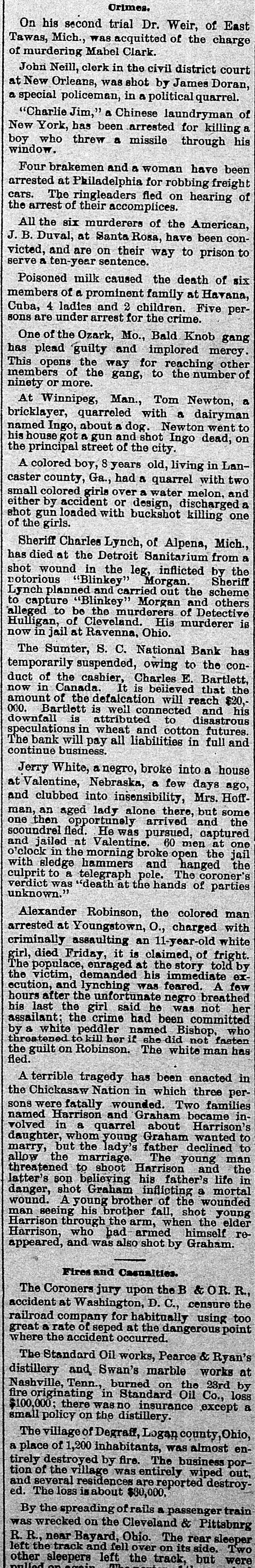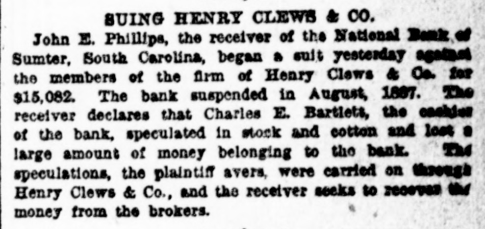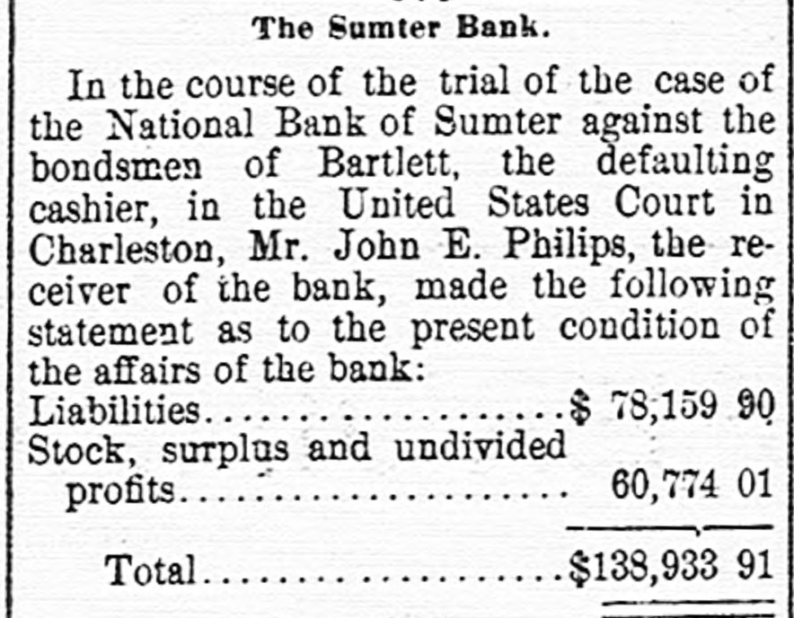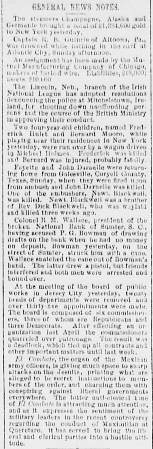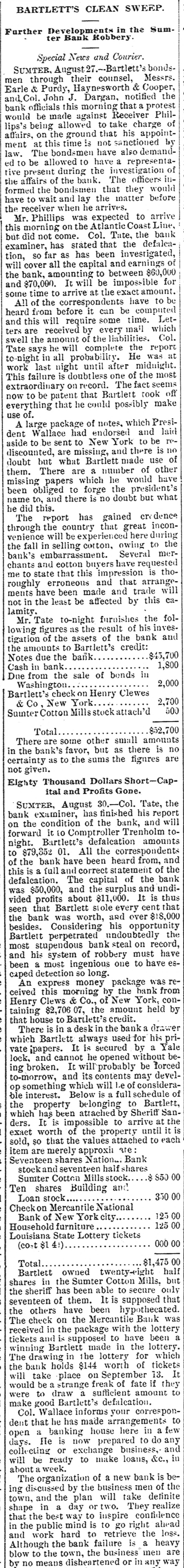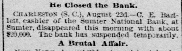 hibits. The inquiries for information about the fair are more numerous than usual, and the indications favor an exceptionally large exhibit of live stock. At Spartanburg, Saturday was appoiuted as the day for the Clifton strikers to show cause before Trial Justice Thackston why they should not be evicted. Mr. Wilson represented the employes and Mr. Simpson the company. The case of Mr. Busby was taken up, and after much evidence and short arguments the Judge decided that the company was entitled to have the writ of ejectment enforced. There are twenty-two other similar cases. C. W. Forster, of Gergetown, expected to make a considerable quantity of scuppernong wine this fall from the vineyard at Friendfield plantation. The vines bore abundantly, and were jealously watched and guarded until a few days ago, when they were left unprotected for a brief interval. When Mr. Forster returned to gather some grapes his vines had been swept clean by the negroes, and not a cluster of the fruit could be found. Richmond Fraser (colored) died after an illness of several weeks. He jumped from a window in the new school building which is being put up in Abbeville for the benefit of the colored people, and hurt ankle. The injury was not thought to be severe at the time, and he continued to work for several days, when he began to suffer. He took his bed, mortification set in, the foot was amputated. and now he is dead. He was study. ing theology with a view to preaching. The fact that SO many deaths have OCcurred among the South Carolina College students, at Camden, caused by fever, is be ing freeiy discussed. The matter ought to be investigated, and, if the cause is in the college buildings or in the water supply of the students, it ought to bespeedily removed or the fact made known that such is not the case, for at present it seems to be believed that the cause of this fever, which has produced death in various parts of the State, lies in the buildings or water supply of the college." The case of W. A. Pollard, ex-postmaster at Greer's Station, near Greenville, for obthe mail and opening letters to pry to secrets, was heard before Commissioner Hawthorn Monday. Pollard was postmaster at Greer's for twelve years before his removal last June on account of complaints of this character. He is charged with breaking open two letters written by Congressman Perry to Dr. League, at Greer's, concerning the management of the office. Pollard was sent up to court, giving bond for $300. The ginning outfit and corn mill of Mr. O. P. Wilson, situated about half a mile from Campbellton, was destroyed by fire Monday. The fire was discovered in the lint room, about 8 o'clock, while the gin was in motion, and the generally accepted theory is that it originated from a match or friction. The loss, including nine bales of cotton, a quantity of cotton seed, damage to engine, etc., will probably amount to $2,000 he property was insured in the Home, of New York, for $1,000, two-thirds of which amount is collectible. Jesse Blaine, a colored man living on Waccamaw, was shot and killed at Clifton plantation on Monday night by Titus Small (colored). The shooting was done with a shotgun, and death ensued almost immediately. The tragedy is said to have been caused by Blaine's intimacy with Small's wife. It is said that Blaine sent the woman over to Georgetown Monday night, and had made arrangements to meet her the next morning, when they were to go to Charleston together. The murderer fled, and has not yet been arrested. Mr. A. K. Mann, while working at Cruise's mill, in Anderson county, last week, was bitten twice on the right forearm by a spider, and the result was a highly inflamed wound and a great deal of physical suffering. Before going to work Mr. Mann donned an old woolen shirt, expecting to get wet while working about the wheel, and did not notice until after he felt the sting of a bite the second time that a large spider had made a nest in the sleeve of the shirt. When he felt the first sting he rubbed the place slightly, thinking it was a splinter, and at the second sting he rubbed more vigorously, but still kept at work. In about an hour the pain increased a great deal and the wrist began to swell, when an examination showed the remains of a large spider and a nest of eggs mashed over the arm. Theskin came off all over the surface touched by the mashed substance, showing the intensely poisonous nature of the insect. E. W Moise, Jr., a son of Charles H, Moise, of Sumter, has written home that he saw Charles E. Bartlett. the defaulting bank cashier, in San Antonio, Texas, a few days ago. Mr. Moise has been a resident of San Antonio for a number of years, and knew Bartlett both out there and at home. This verifies the belief that many persons have that Bartlett went to Mexico, although it is somewhat a mystery how he could have also been seen in Washington and New York, as has been reported on reliable authority. There is also a belief among a large number of people that he has gone to South America. When he took the North-eastern train for Charleston, on the night of his flight, he could have continued to Tampa, Fla., and reached that city the same day that a vessel was advertised to sail for South America. There is nothing new relative to the bank failure. Receiver Phillips isquietly working away winding up the business, although it is hard to tell when he will finish. Bartlett's bondsmen hold occasional meetings, but nothing can be gotten out of them concerning their proposed course. Some of them intend to fight to the lastagainst being held liable, while a number of them express themselves as willing to pay up their quota of the bond and have no further trouble about it. It is not yet known whether or not the matter will be tried at the October court. SUMTER, Sept. 19.-Special -Q a ripple of excitement was caused at Sumter Monday morning by a fight between Col. R. M. Wallace, President of the defunct Sumter National Bank, and