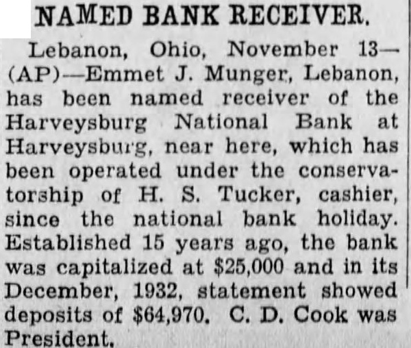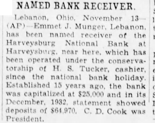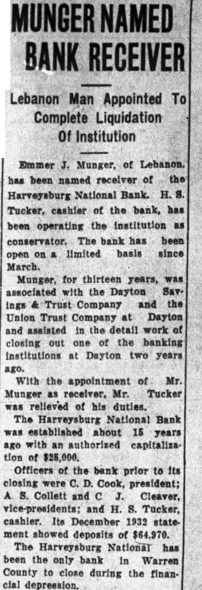 MUNGER NAMED BANK RECEIVER Lebanon Man Appointed To Complete Liquidation Of Institution Emmer J. Munger, of Lebanon. has been named receiver of the Harveysburg National Bank. H. S. Tucker, cashier of the bank, has been operating the institution as conservator. The bank has been open on a limited basis since March. Munger, for thirteen years, was associated with the Dayton Sav. ings & Trust Company and the Union Trust Company at Dayton and assisted in the detail work of closing out one of the banking institutions at Dayton two years ago. With the appointment of Mr. Munger as receiver, Mr. Tucker was relieved of his duties. The Harveysburg National Bank was established about 15 years ago with an authorized capitalization of $25,000. Officers of the bank prior to its closing were C. D. Cook, president; A. S. Collett and C J. Cleaver, vice-presidents; and H. S. Tucker, cashier. Its December 1932 state. ment showed deposits of $64,970. The Harveysburg National has been the only bank in Warren County to close during the financial depression.