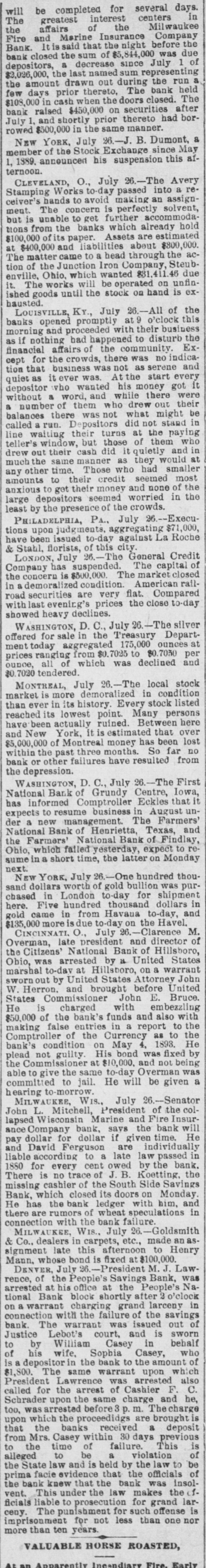 for The of Insurancht due Julyenting the the held bank few The closed. after had bor& B. since Dum May this The July Avery into an solvent, hold already $300, acthe 46 due on unfin is exof the this their and the Ex no was indicacept as erane tion start every got who while there were of out their drew be not what might in did stand at the their of who them those in and quietly had who but did they smaller most of the d none in the by growds. 26. July Executions $71,000, La Roche issued of Credit July cityleneral of The prices ized $500.dition fiat. the close day heavy silver Depart ounce 7030 per and which stock local dition listed than Many here ruined. that over lost been far So no from resulted The First Iowa, Centre, that has The and Texas, of day, the Bank Findla to Ohio, failed on the time, expectation next. One thouYORK, July hundred of bu was allion gold purin for to-day chased shipment in London dollars here. hundred hundred and day, came gold Havaua due Havel. 26. o. M. July of and esident Five in from day on Clarence of tional Bank National Hillsboro, was States Ohio, United at warrant warrant John States and before the verman Hillsboro, by Attorney on Inited E. brougJohn Bruce. embezzline with bank's Combarged funds with report and also to to the the He on His bond of the entries Currency 1893. fixed by 000. and not the false the May was being was the Overman to He jail. plead not agioner at to-day will be given 26. July Senator of the colJohn lapsed WIS. President Fire Insur- will company dollar pay dollar hearing MILWA Mitche Marine and the time. bank He ally are David Ferguson law late Wisconsing if given nassed liable by the owed 1880 for cent bank. no every the betting. J.B. trace There of the Side South cashier Savings missing its doors Bank, which Monday. He and him, bank has ledger of in ations wheat rumors the with bank failure. 26. July WIS.. MIL Goldsmith & etc., Co., made dealers to this late Henry is 0.000. bond M.J. DEN Lawwas of the Bank, rence, People Nathe his office 2 after block tional Bank a in on warrant larceny charging of with the the savings of out was connect The bank. warrant is and court, sworn Justice Lebot's in to Casey behalf William of his who Casey, Sophia of same by wife. the bank marrant to arrested upon also C. Washier he, Eliosident Lawrence of charkThe Charge and upon too. was which the pro the that banks Mrs. rithin from Schrader called for upon the the p. m. are brought is deposit 30 days Casey of to the time This of to be failure be by the held the law of the officials was the bank insolmakes vent. for larficials is such offense one nor than centigonment more HORSE ROASTED, Early Fire