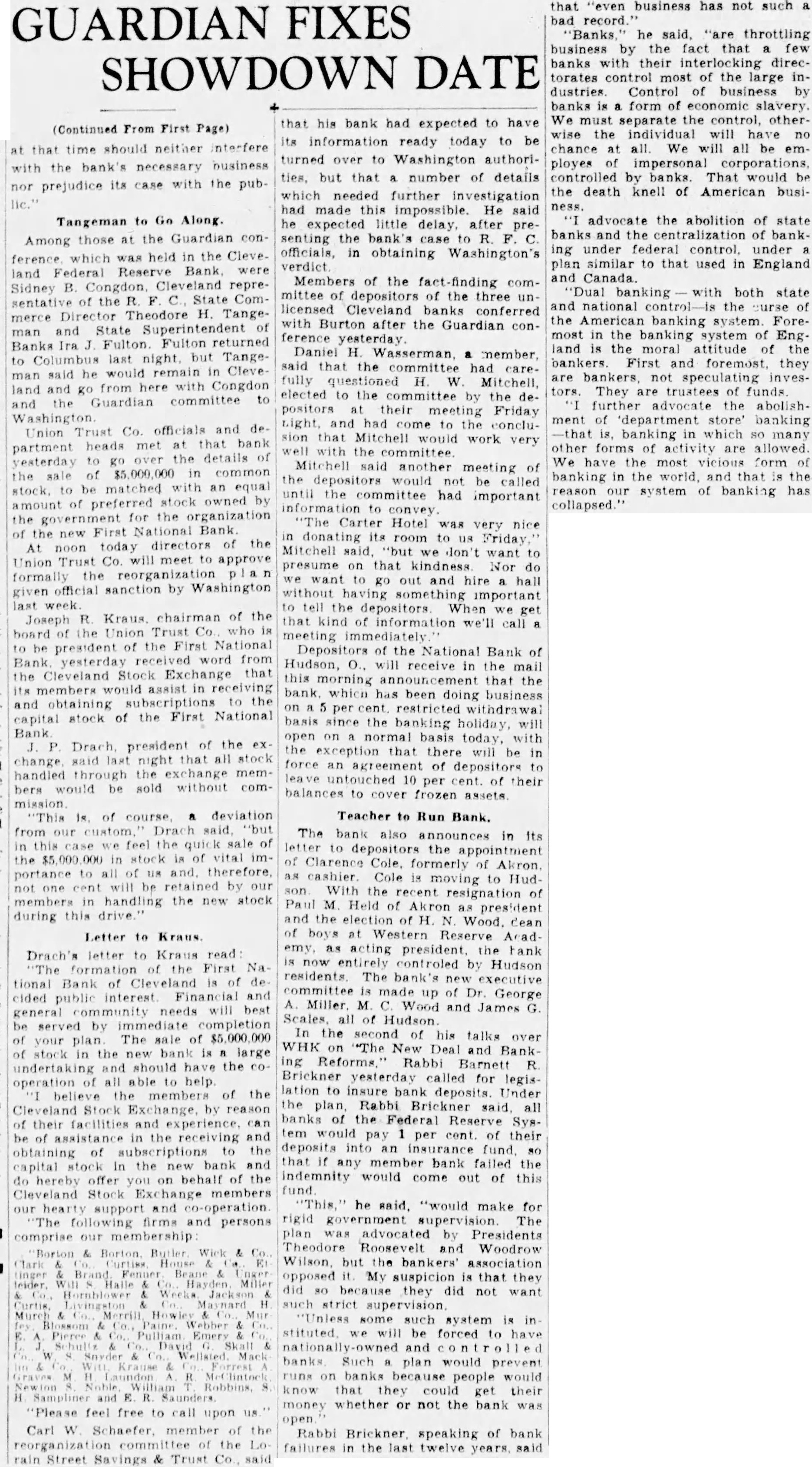 GUARDIAN FIXES SHOWDOWN DATE (Continued From First Page) at that time should neither interfere the necessary business prejudice its case with the Tangeman to Go Along. Among those at the Guardian conwas held in the land Federal Bank were Sidney B. Cleveland representative of the R. State ComDirector Theodore H. Tangemerce State Superintendent of man and Banks Ira Fulton. Fulton returned Columbus but to man said he in from here and Guardian committee to and Union Trust Co. officials and heads met bank partment yesterday over the details of in common the to be matched an equal stock by amount of for the organization the First National Bank of the new directors of the today Trust will meet to approve Union Co. formally the official sanction by Washington given last week. of the Joseph R. the who board the First National be president Bank yesterday word from Cleveland Stock Exchange that the members assist receiving to the and of the First National president of the change said last that all stock handled through the memwould be sold without of course deviation from our in this feel the sale the in vital to will be by members in handling the new stock during this drive. Letter to Kraus Drach's letter Kraus read the First Na tional of interest and cided public general community needs will best be served by immediate your plan The sale of in bank large undertaking and should have the CO. operation all able help believe the members of the Cleveland Stock Exchange by reason of their and be of in the and obtaining capital bank and do hereby offer behalf of the Stock members our support and co-operation following firms and persons comprise membership Borton and feel free to call upon Carl the Trust said that his bank had expected to have its information ready today to be turned over to Washington authoribut that number of details which needed further investigation had made He said he expected little delay, after presenting the bank's R. officials, in obtaining Washington's verdict Members of the fact-finding committee depositors of the three unlicensed Cleveland banks conferred with after the Guardian conference Daniel H. Wasserman said that the committee had care. fully questioned H. W elected to the by the positors their meeting Friday and had come to the conclusion that Mitchell would work very with the Mitchell said another meeting of the depositors would not be called until the committee had important convey Carter Hotel was very nice its room Friday Mitchell said want to presume on that kindness Nor do we to out and hall without important to tell the When we get that kind of information we'll call meeting immediately Depositors of the National Bank of Hudson, O., will receive in the mail this the that bank which has been doing business per restricted withdrawal basis since the will open on normal basis with the exception that there be in force an agreement of depositors 10 per of to assets Teacher to Run Bank. The bank also announces in depositors the appointment Clarence formerly of Akron cashier. Cole moving to Hud the of Paul M Held president and the of Western Reserve Acad emy as acting the tank is now entirely by Hudson residents. The executive committee is made of Dr George and James G. of Hudson In the of his talks WHK "The New Deal and ing Rabbi Barnett Brickner yesterday called for legisbank deposits Under the Rabbi Brickner said all the Syspay per cent of their deposits an insurance fund that any member bank the indemnity would come out of this he "would make for rigid government The advocated Presidents Theodore Roosevelt and Woodrow but the bankers' association opposed My suspicion is that they because they did not want such strict some such system is in be forced to have banks prevent on banks because people they get their whether or not the bank Brickner speaking of bank failures in the twelve said that "even business has not such bad business by the fact that few banks with their directorates most of the large industries Control of business banks is form of slavery We must separate the wise the individual will have chance at We will all be ployes of impersonal corporations, controlled by banks That would be the death knell of American business advocate the abolition of state banks and the of banking under federal under plan similar to that used in England and Canada. banking with both state and national the American banking Foremost in the banking system of Eng is the moral attitude of the bankers First and foremost, they speculating tors They are trustees of funds further advocate the ment of department store' banking banking which so many other forms of allowed We have the most vicious form banking in the and that the reason our system of has collapsed.