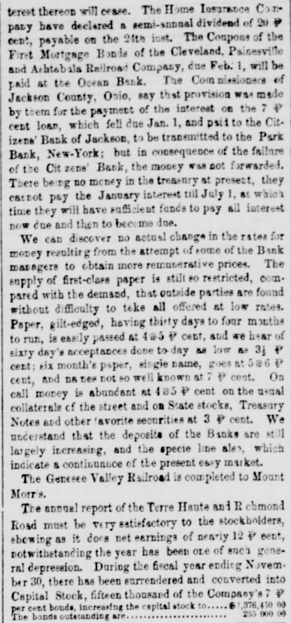terest thereon will cease. The Home Insurance Con pary have declared a semi-annual dividend of 20 cent, payable on the 24th just. The Coupons of the First Mortgage Bonds of the Cleveland, Painesville and Ashtabala Railroad Company, due Feb. 1, will be paid at the Ocean Bank. The Com missioners of Jackson County, Ohio, say that provision was made by them for the payment of the interest on the 7 ₽ cent loan, which fell due Jan. 1, and psit to the Citizens' Bank of Jackson, to be transmitted to the Park Bank, New-York; but in consequence of the failure of the Cit zens' Bank, the money was not forwarded. There being no money in the treasury at present, they casnot pay the January interest till July 1, at which time they will have sufficient funds to pay all interest now due and then to become due. We C&D discover no actual change in the rates for money resulting from the attempt of some of the Bank managers to obtain more remunerative prices. The supply of first-class paper is stilt 80 restricted, com. pared with the demand, that outside parties are found without difficulty to take all offered at low rates. Paper, gilt-edged, having thirty days to four months to run, is easily passed at 4@5 ₽ cent, and we hear of sixty day's acceptances done to day &8 low as 31 cent; six month's paper, single name, goes at 5@6 cent, and D8 nes not 80 well known at 7 ₽ cent. On call money is abundant at 4@5 P cent on the usual collaterals of the street and on State stocks, Treasury Notes and other favorite securities at 3 P cent. We understand that the deposite of the Banks are still largely increasing, and the specie line also, which indicate & continuance of the present easy market. The Genesee Valley Railroad is completed to Mount Morris. The annual report of the Terre Haute and R chmond Road must be very satisfactory to the stockholders, aboving as it does net earnings of nearly 12 P cent, notwithstanding the year has been OLE of such general depression. During the fiscal year ending Novem. ber 30, there has been surrendered and converted into Capital Stock, fifteen thousand of the Company's 7 ₽ $1,376,450 00 per cent bouds, increasing the capital stock to 285 000 09 The bonds outstanding are