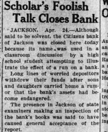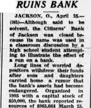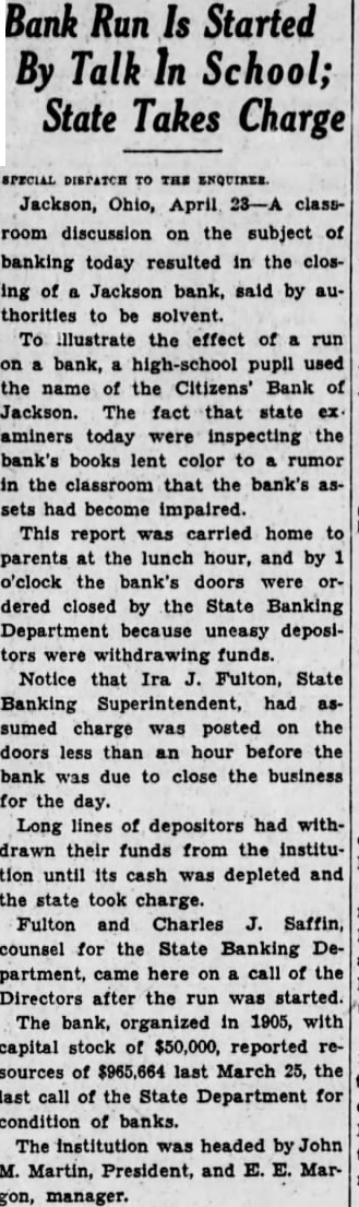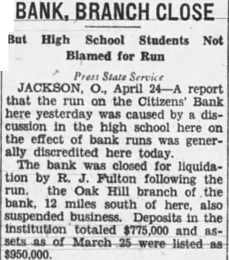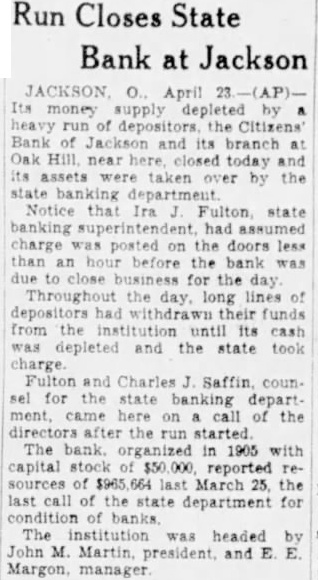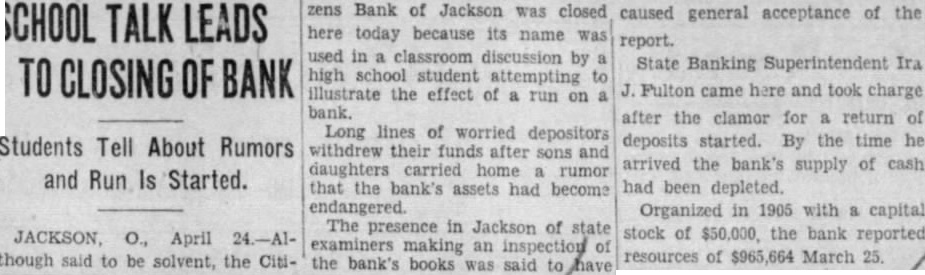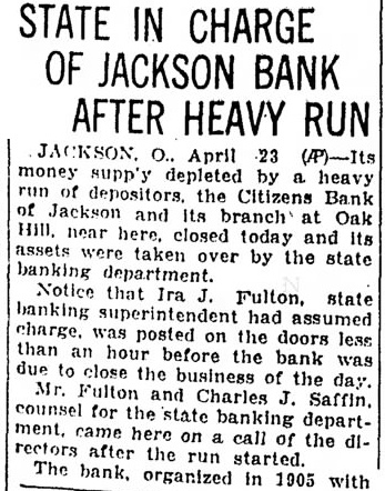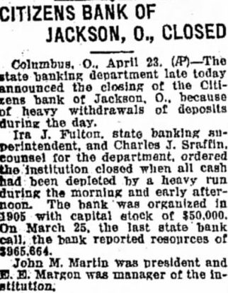 Started By Talk State Takes Charge Jackson, Ohio, April discussion the subject banking today resulted the closof Jackson bank, said thorities to be solvent. To the effect of bank, high-school pupil used the name the Citizens' Bank of Jackson. The fact that state aminers today inspecting the bank's books lent color to rumor that the bank's had become impaired. This report was carried home parents the lunch hour, and o'clock the bank's doors dered closed by the State Banking Department because uneasy depositors funds. Notice that Ira Fulton, State Banking Superintendent, had sumed charge posted on the doors less than an hour before the bank due to close the business for the day. Long lines depositors had withdrawn their funds from the institution until its cash was depleted and the state took charge. Fulton Charles Saffin, counsel for the State Banking Department, came here call the Directors after the run started. bank, organized in 1905, with capital stock of $50,000, reported sources of $965,664 last March the call the State Department for condition of banks. The was headed by Martin, President, and gon, manager.
