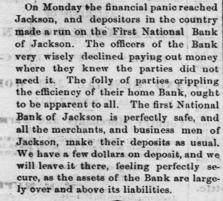 On Monday the financial panic reached Jackson, and depositors in the country made a run on the First National Bank of Jackson. The officers of the Bank very wisely declined paying out money where they knew the parties did not need it. The folly of parties crippling the efficiency of their home Bank, ought to be apparent to all. The first National Bank of Jackson is perfectly safe, and all the merchants, and business men of Jackson, make their deposits as usual, We have a few dollars on deposit, and we will leave it there, feeling perfectly secure, as the assets of the Bank are largely over and above its liabilities.