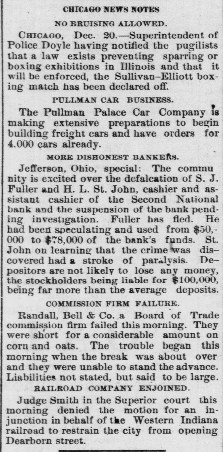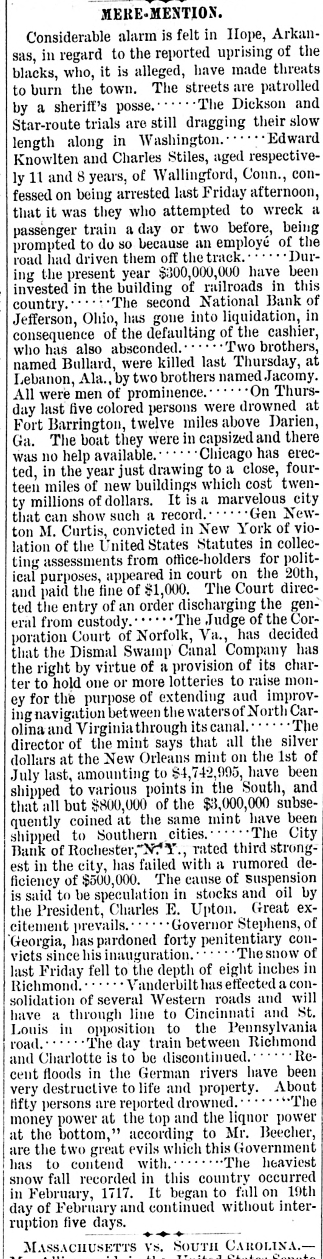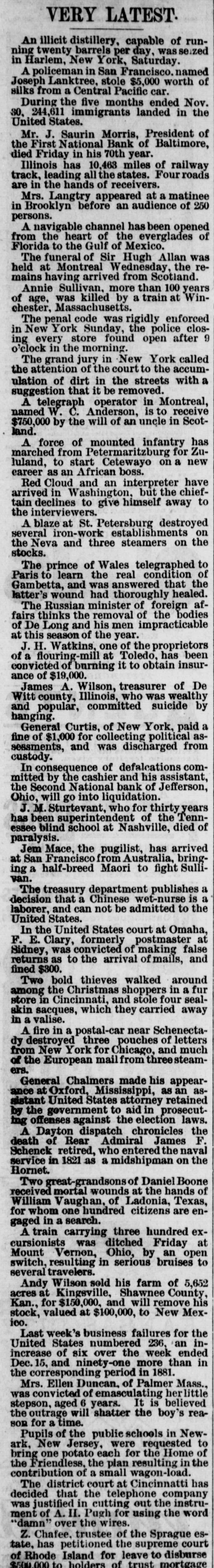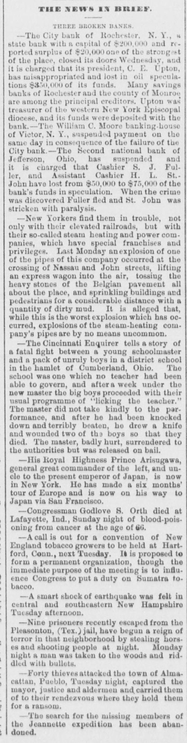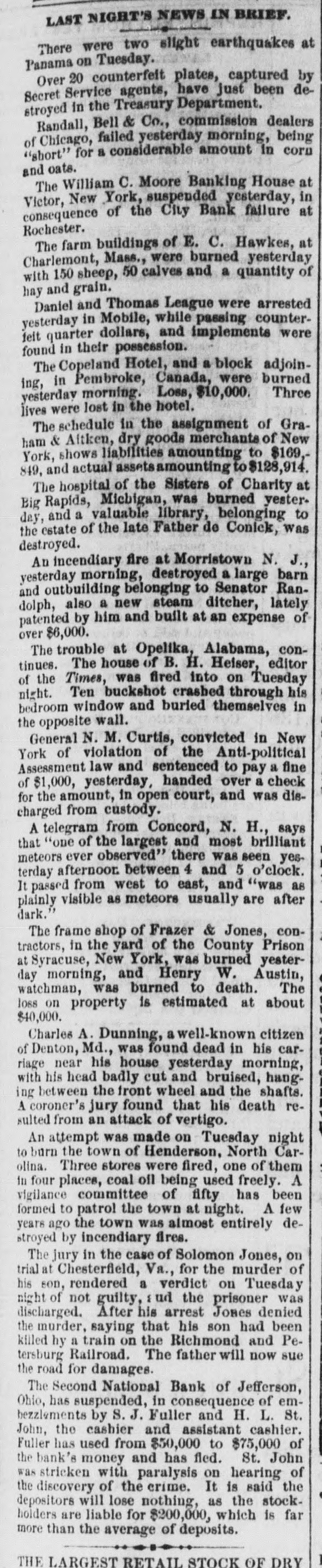 LAST NIGHT'S NEWS IN BRIEF. There were two slight earthquakes at Panama on Tuesday. 20 counterfeit plates, captured by Service Secret in the of being for a corn and William at stroyed "short" The Over Randall, Chicago, oats. Bell failed considerable Treasury C. agents, & yesterday Moore Co., have Department. commission Banking amount morning, just House been in dealers deVictor, New York, suspended yesterday, in consequence of the City Bank failure at Rochester. The farm buildings of E. C. Hawkes, at Charlemont, Mass., were burned yesterday with 150 sheep, 50 calves and a quantity of hay and grain. Daniel and Thomas League were arrested yesterday in Mobile, while passing counterfeit quarter dollars, and implements were found in their possession. The Copeland Hotel, and a block adjoining, in Pembroke, Canada, were burned Three yesterday morning. Loss, $10,000. lives were lost in the hotel. The schedule in the assignment of Graham & Altken, dry goods merchants of New York, shows liabilities amounting to $169. 849, and actual assets amounting to $128,914. The hospital of the Sisters of Charity at Big Rapids, Micbigan, was burned yester day, and a valuable library, belonging to the estate of the late Father de Conick, Was destroyed. An incendiary fire at Morristown N. J., yesterday morning, destroyed a large barn and outbuilding belonging to Senator Randolph, also a new steam ditcher, lately patented by him and built at an expense of over $6,000. The trouble at Opelika, Alabama, continues. The house of B. H. Heiser, editor of the Times, was fired into on Tuesday night. Ten buckshot crashed through his bedroom window and buried themselves in the opposite wall. General N. M. Curtis, convicted in New York of violation of the Anti-political Assessment law and sentenced to pay a fine of $1,000, yesterday, handed over a check for the amount, in open court, and was diecharged from custody. A telegram from Concord, N. H., says that "one of the largest and most brilliant meteors ever observed" there was seen yesterday afternoon. between 4 and 5 o'clock. It passed from west to east, and "was as plainly visible as meteors usually are after dark." The frame shop of Frazer & Jones, contractors, in the yard of the County Prison at Syracuse, New York, was burned yesterday morning, and Henry W. Austin, watchman, was burned to death. The loss on property is estimated at about $40,000. Charles A. Dunning, a well-known citizen of Denton, Md., was found dead in his carriage near his house yesterday morning, with his head badly cut and bruised, hanging between the front wheel and the shafts. A coroner's jury found that his death resulted from an attack of vertigo. An attempt was made on Tuesday night to burn the town of Henderson, North Carolina. Three stores were fired, one of them in four places, coal oil being used freely. A vigilance committee of fifty has been formed to patrol the town at night. A few years ago the town was almost entirely destroyed by incendiary fires. The jury in the case of Solomon Jones, on trial at Chesterfield, Va., for the murder of his son, rendered a verdict on Tuesday night of not guilty, ud the prisoner was discharged. After his arrest Jones denied the murder, saying that his son had been killed hy a train on the Richmond and Petersburg Railroad. The father will now sue the road for damages. The Second National Bank of Jefferson, Ohio, has suspended, in consequence of embezzlements by S. J. Fuller and H. L. St. John, the cashier and assistant cashier. Fuller has used from $50,000 to $75,000 of the bank's money and has fled. St. John stricken with paralysis on hearing of the discovery of the crime. It is said the depositors will lose nothing, as the stock. holders are liable for $200,000, which is far more than the average of deposits. THE LARGEST RETAIL STOCK OF DRY