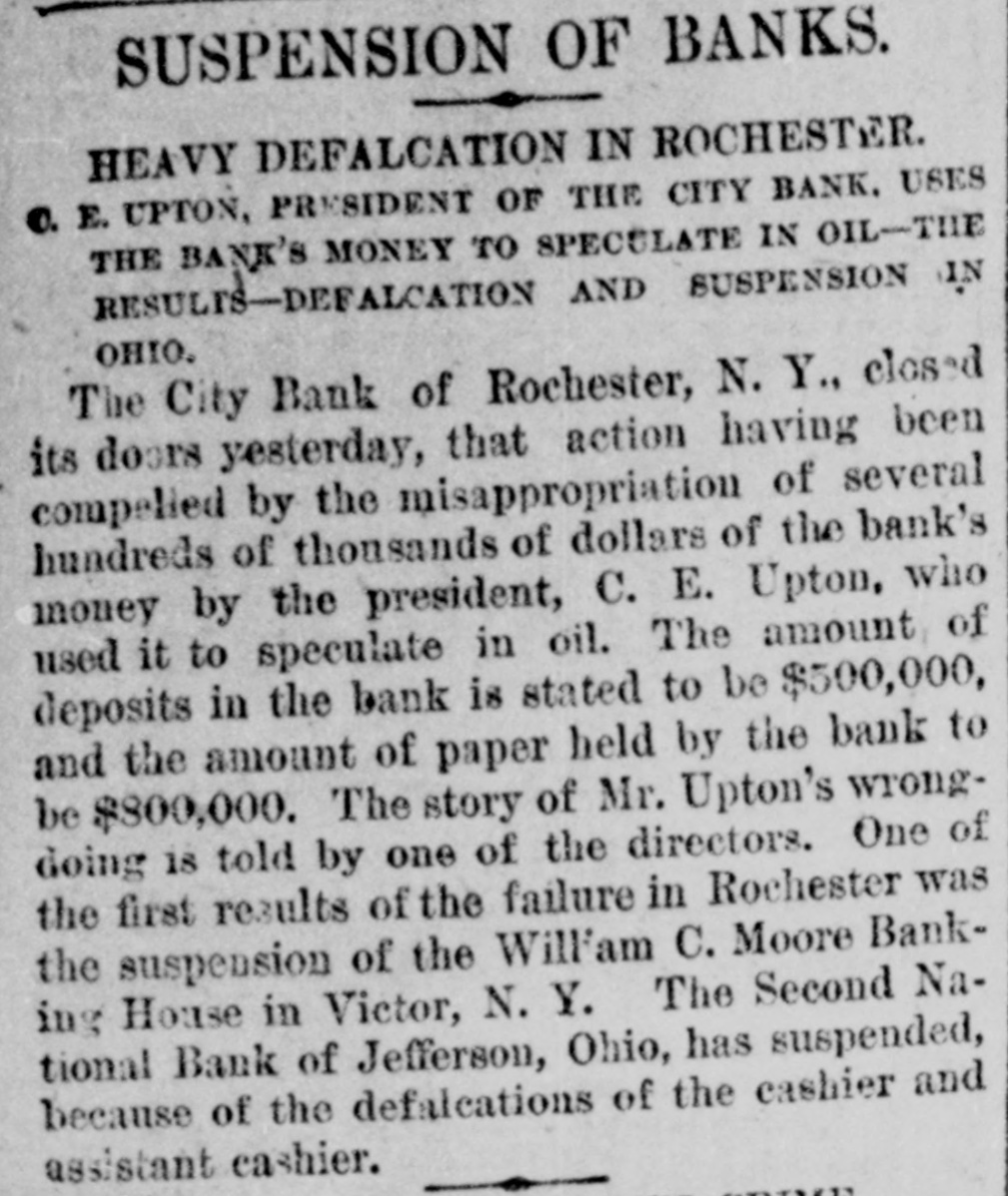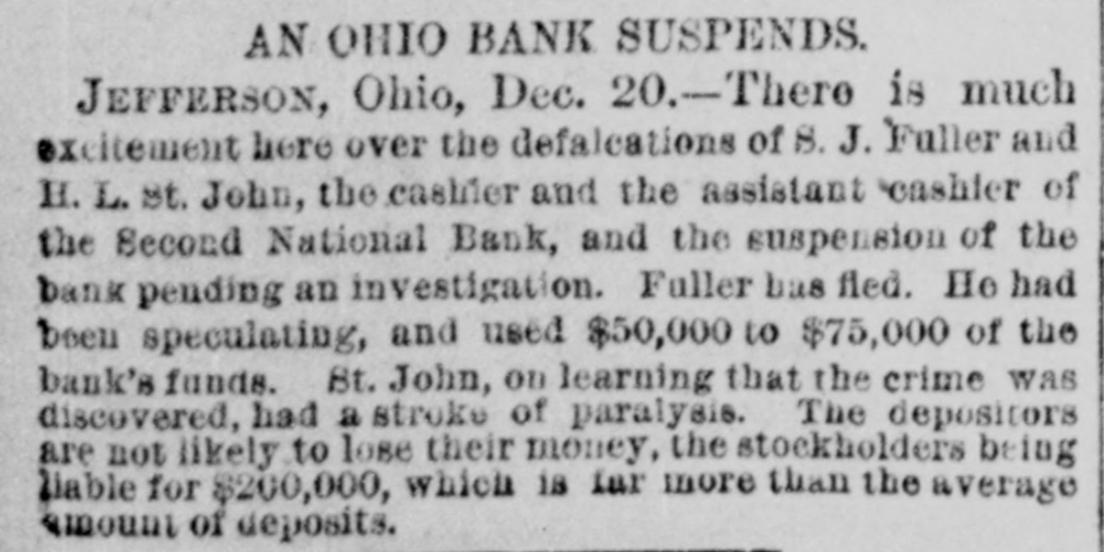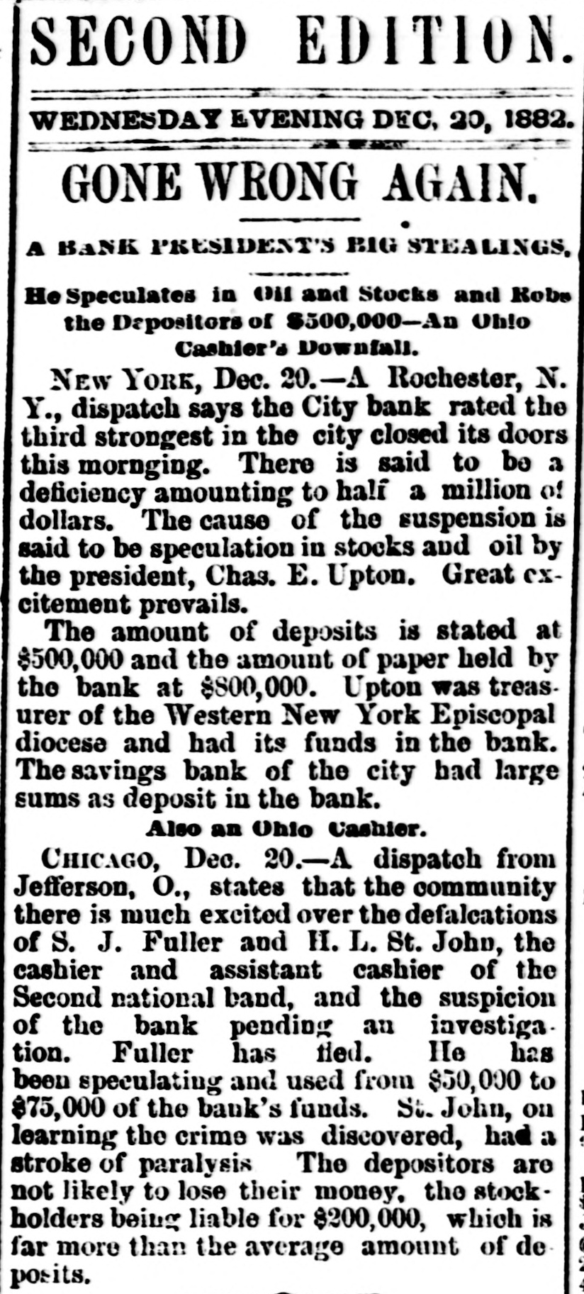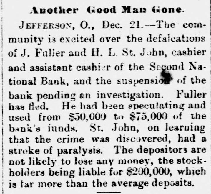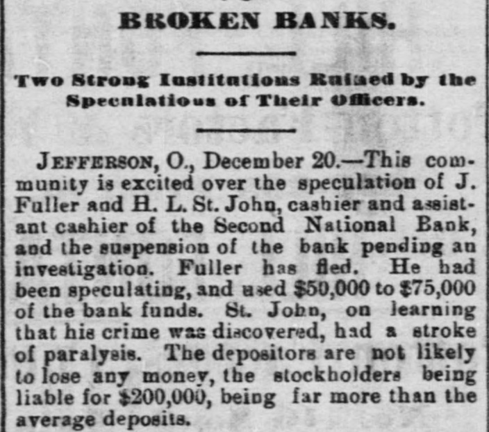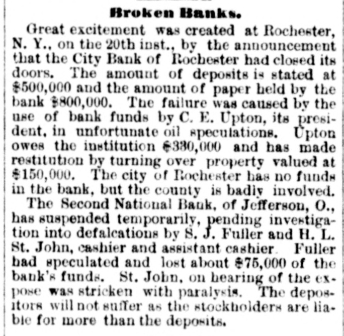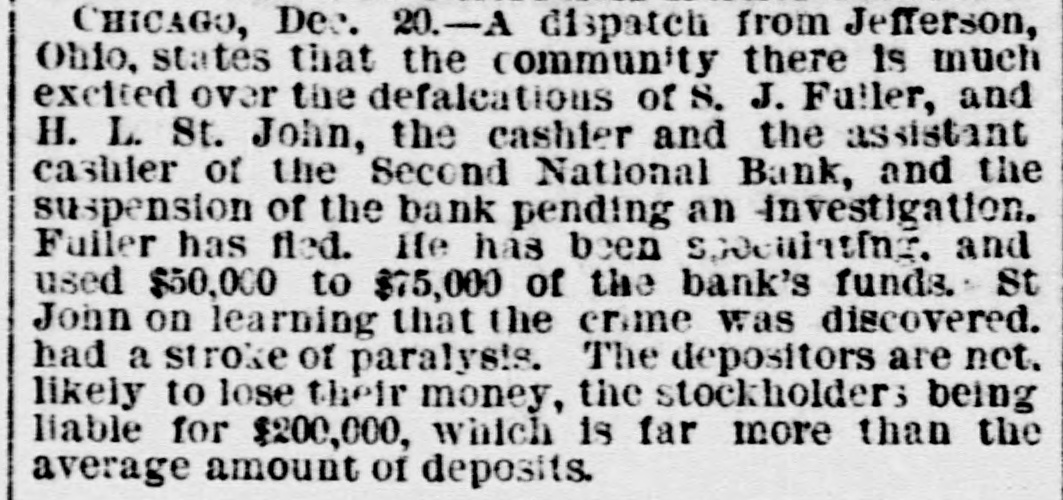 LAST NIGHT'S NEWS IN BRIEF. There were two slight earthquakes at Panama on Tuesday. 20 counterfeit plates, captured by Service Secret in the of being for a corn and William at stroyed "short" The Over Randall, Chicago, oats. Bell failed considerable Treasury C. agents, & yesterday Moore Co., have Department. commission Banking amount morning, just House been in dealers deVictor, New York, suspended yesterday, in consequence of the City Bank failure at Rochester. The farm buildings of E. C. Hawkes, at Charlemont, Mass., were burned yesterday with 150 sheep, 50 calves and a quantity of hay and grain. Daniel and Thomas League were arrested yesterday in Mobile, while passing counterfeit quarter dollars, and implements were found in their possession. The Copeland Hotel, and a block adjoining, in Pembroke, Canada, were burned Three yesterday morning. Loss, $10,000. lives were lost in the hotel. The schedule in the assignment of Graham & Altken, dry goods merchants of New York, shows liabilities amounting to $169. 849, and actual assets amounting to $128,914. The hospital of the Sisters of Charity at Big Rapids, Micbigan, was burned yester day, and a valuable library, belonging to the estate of the late Father de Conick, Was destroyed. An incendiary fire at Morristown N. J., yesterday morning, destroyed a large barn and outbuilding belonging to Senator Randolph, also a new steam ditcher, lately patented by him and built at an expense of over $6,000. The trouble at Opelika, Alabama, continues. The house of B. H. Heiser, editor of the Times, was fired into on Tuesday night. Ten buckshot crashed through his bedroom window and buried themselves in the opposite wall. General N. M. Curtis, convicted in New York of violation of the Anti-political Assessment law and sentenced to pay a fine of $1,000, yesterday, handed over a check for the amount, in open court, and was diecharged from custody. A telegram from Concord, N. H., says that "one of the largest and most brilliant meteors ever observed" there was seen yesterday afternoon. between 4 and 5 o'clock. It passed from west to east, and "was as plainly visible as meteors usually are after dark." The frame shop of Frazer & Jones, contractors, in the yard of the County Prison at Syracuse, New York, was burned yesterday morning, and Henry W. Austin, watchman, was burned to death. The loss on property is estimated at about $40,000. Charles A. Dunning, a well-known citizen of Denton, Md., was found dead in his carriage near his house yesterday morning, with his head badly cut and bruised, hanging between the front wheel and the shafts. A coroner's jury found that his death resulted from an attack of vertigo. An attempt was made on Tuesday night to burn the town of Henderson, North Carolina. Three stores were fired, one of them in four places, coal oil being used freely. A vigilance committee of fifty has been formed to patrol the town at night. A few years ago the town was almost entirely destroyed by incendiary fires. The jury in the case of Solomon Jones, on trial at Chesterfield, Va., for the murder of his son, rendered a verdict on Tuesday night of not guilty, ud the prisoner was discharged. After his arrest Jones denied the murder, saying that his son had been killed hy a train on the Richmond and Petersburg Railroad. The father will now sue the road for damages. The Second National Bank of Jefferson, Ohio, has suspended, in consequence of embezzlements by S. J. Fuller and H. L. St. John, the cashier and assistant cashier. Fuller has used from $50,000 to $75,000 of the bank's money and has fled. St. John stricken with paralysis on hearing of the discovery of the crime. It is said the depositors will lose nothing, as the stock. holders are liable for $200,000, which is far more than the average of deposits. THE LARGEST RETAIL STOCK OF DRY