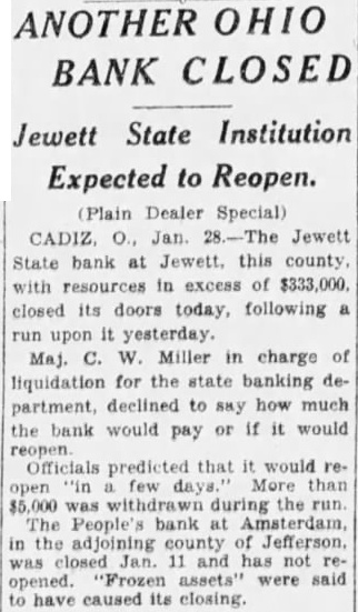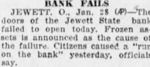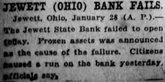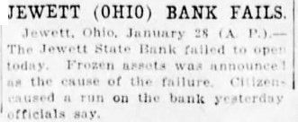 (OHIO) BANK FAILS Ohio, Jewett State Bank failed to open Frozen assets was announced cause of the failure. Citizens on the bank
