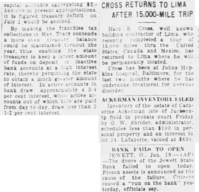 capital accounts present is figured treasury deficit on July would be avoided. By making the franchise tax collections in May Tracy contends more balance could be maintained thruout the year, thus enabling the state treasurer to keep amount of funds on deposit inactive bank accounts at high interest rate, thereby permitting the state to obtain much greater amount of In active accounts in bank draw 3-4 per cent interest, active counts out of which paid from day to day, draw less than 1-2 per cent CROSS RETURNS TO LIMA AFTER 15,000-MILE TRIP Herb B Cross, well known building contractor of Lima completed tour of recently 15,000 miles thru the United Canada and Mexico has returned to Lima where he be located. Cross has been at Johns Hop kins hospital Baltimore, for the last months where he has undergone treatment for nervous disorder ACKERMAN TLED Inventory of the estate of Catherine Ackerman of field in probate court Friday schedules less than personal property and an interest in lot Lafayette, valued at $696 BANK FAILS TO OPEN The doors of the Jewett State Bank falled to open today Frozen assets is announced as the of the failure Citizens cause caused "run on the bank terday, officials say.